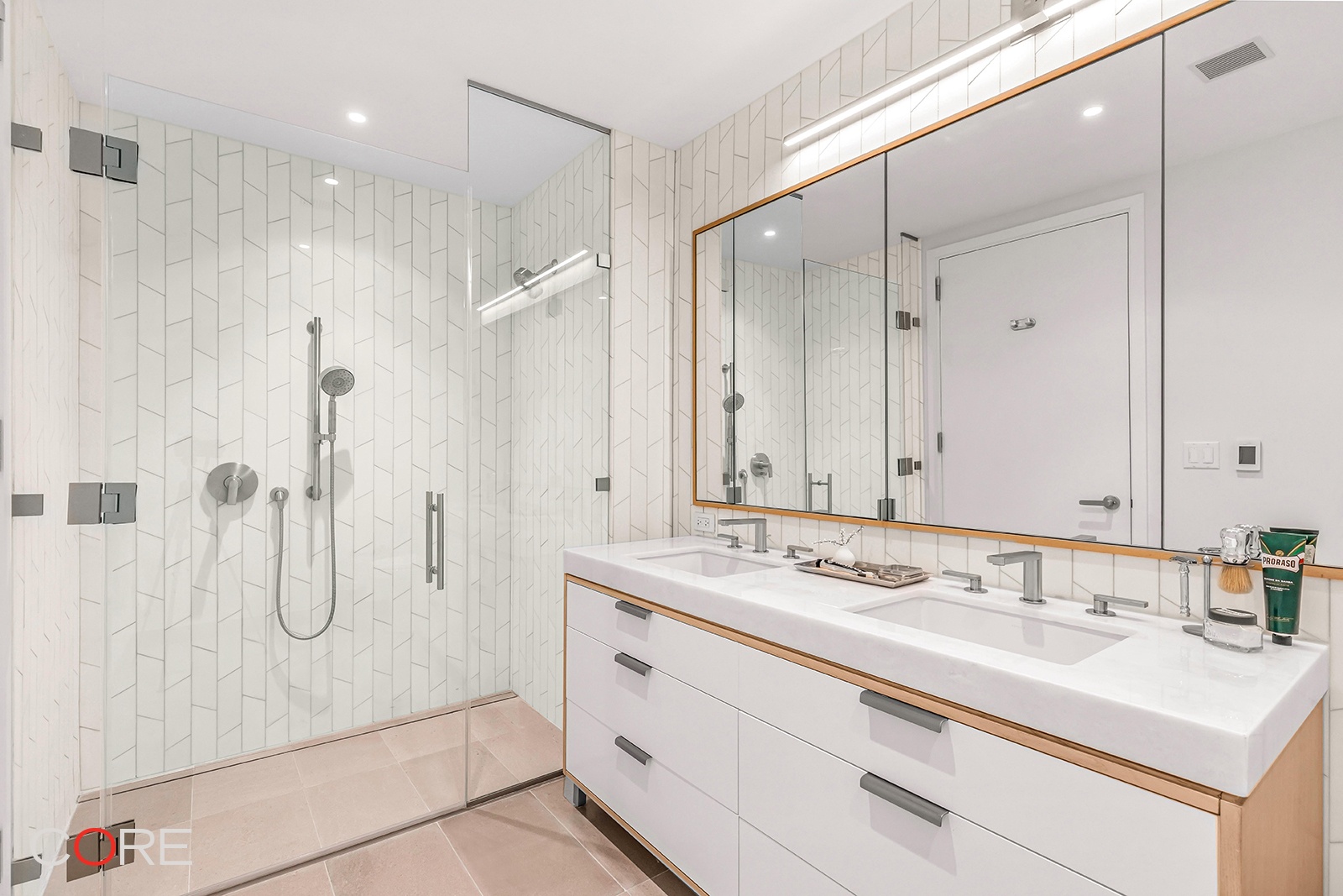 The primary bedroom features an en suite bath, with a spacious glass-enclosed stall shower. The primary bathroom is clad in custom-honed Dream White marble tiles on the walls and vanity counter, with Cinderella Grey marble floors with a honed finish. It features a custom white oak vanity with polished chrome pulls and accents, fixtures by Kohler in a vibrant titanium finish, and a custom mirrored medicine cabinet with oak surround.