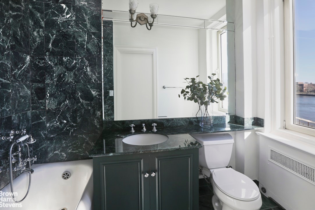 The spacious 28-foot living room is truly impressive with high ceilings, a working wood-burning fireplace, and a beautiful bay window that affords sweeping views of the East River. Adjacent to the living room, the private library provides a versatile retreat. With an ensuite bath and additional wet bar, the library is perfectly suited as an inviting extension of the home's entertainment areas, or as an extra bedroom, if desired.