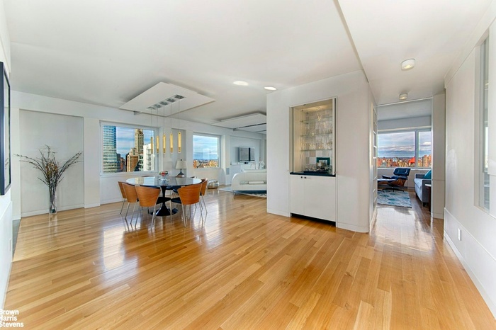 Perfection is the only way to describe this apartment! It is absolutely gorgeous and combines magnificent design with practical utility. It overlooks all of New York City from the 46th floor. One sees North past the George Washington Bridge, West over all of Central Park, East over the East River, Park and South toward the Chrysler Building and the Freedom Tower. The apartment was designed by a well known architect who created walls and woodwork to resemble the skyscrapers of New York City. When the lights are on, the glass within the wood portrays windows and one feels as if they are peering into the hidden life of the City. The beautiful plank floors and sparkling counter tops are a joy to observe. The apartment consists of a huge Living Room, Dining Room, Primary Bedroom and Den with sliding doors. When they are closed a large 2nd Bedroom is created. There are 2.5 gorgeous Bathrooms, a huge open Kitchen, a Washer/Dryer and new soundproof picture windows. The Central A/C is hidden within beautifully designed cabinets. The large Terrace faces Northeast and is quite usable. It is located on Billionaire's Row, public transportation, wonderful shopping and luxury living. The building has 24 hour concierges and doormen. There is a 20,000 square foot Spa with classes, trainers and an indoor/outdoor salt water Pool and a 24 hour Garage. Pets and pied a terres are allowed.