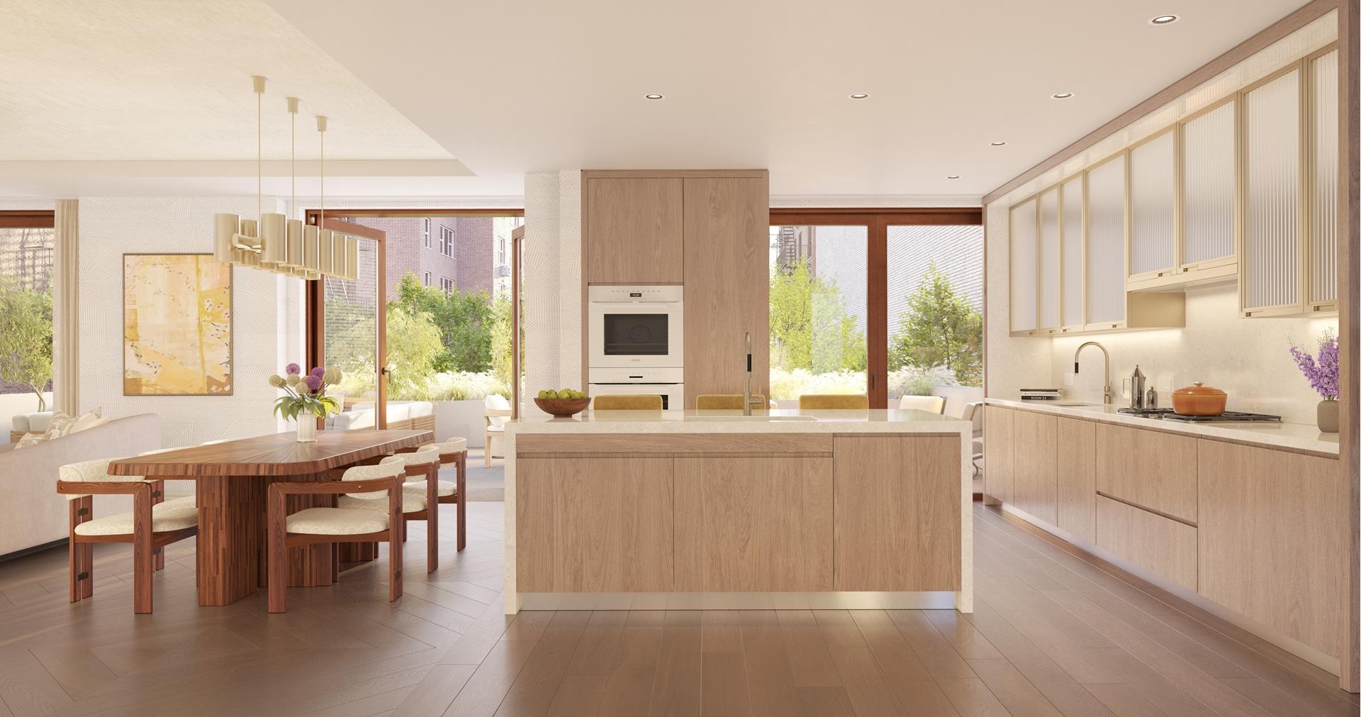 Residence 2A is a 3,905 square foot 4 bedroom duplex, 4.5 bath home with a 800 square foot terrace, with beautifully proportioned rooms and east and west exposures. Floor-to-ceiling windows from Italy allow abundant light to stream across 7 stained oak floors. The generous living and dining spaces open to the island kitchen featuring bespoke, stained ash wood cabinetry with fluted glass upper cabinets and polished Bianco ice marble countertops and backsplash. The top-of-the-line Miele appliances suite features a speed oven and gas cooking. The stainless-steel Pro-Chef sink features a Dornbracht brushed champagne faucet with a pull-down spray. This home features a Sub-Zero wine refrigerator.