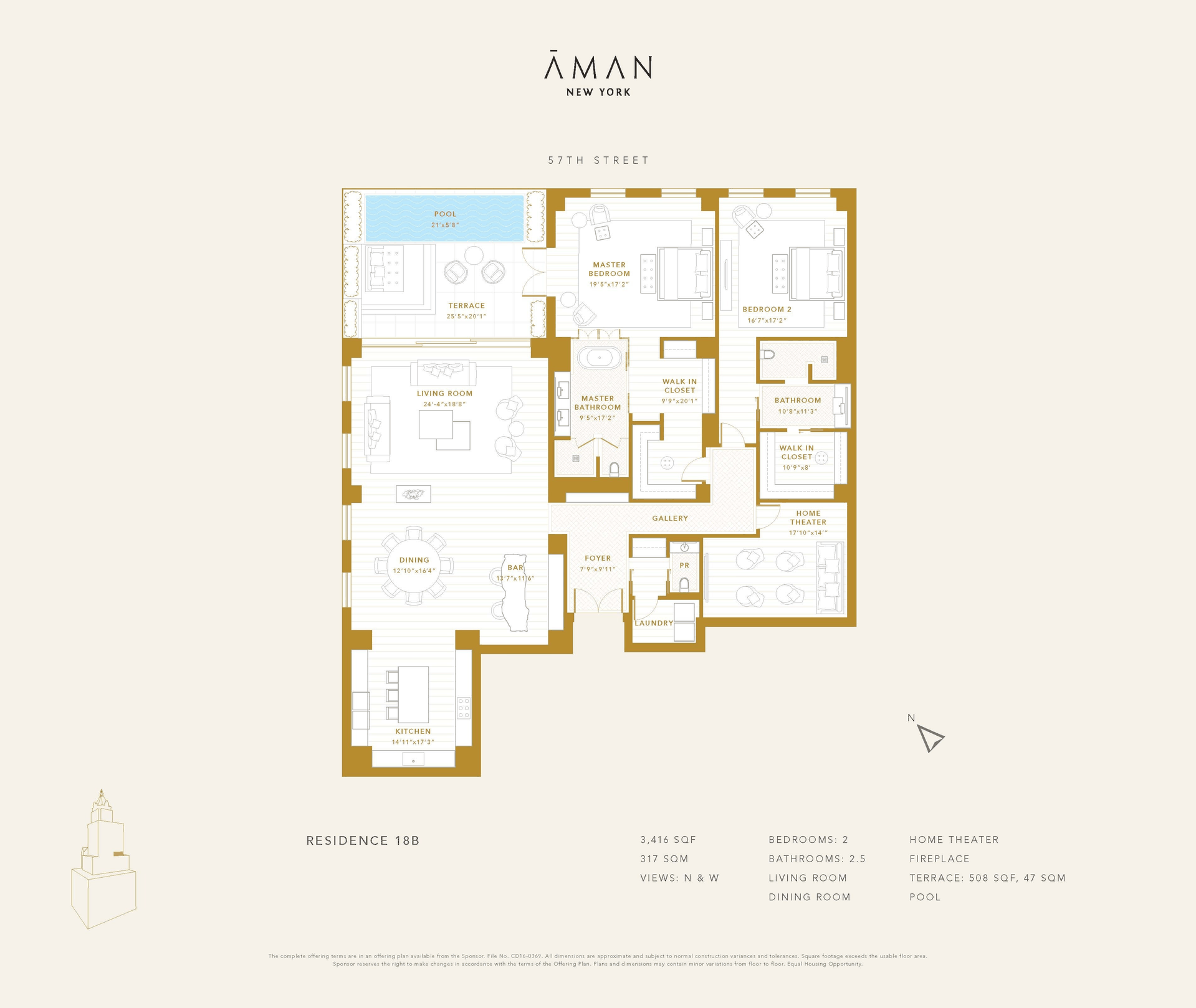 Situated on the 18th floor of Aman New York, this two-bedroom branded, and fully serviced residence offers unparalleled sophistication and privacy, with custom millwork and finishes throughout. Featuring stunning views of Central Park, the residence spans 3,416 sqft of living space with 2 bedrooms, 2.5 bathrooms, a private home theater and terrace, creating a secluded oasis in the heart of Midtown.