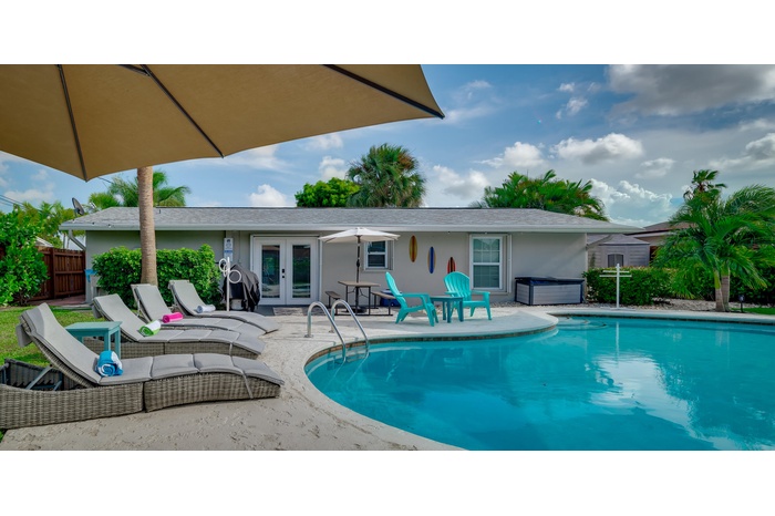 Beautiful 3BR/2BA weekly/monthly vacation & corporate rental in Palm Beach Gardens, just minutes from beaches, golf, dining, and shopping. Recently remodeled with cozy living room, fully equipped kitchen with stainless steel appliances, dining area, and washer/dryer. Sleeps 6-8: king suite, queen room, and full-over-full bunk beds. Private backyard oasis features a gorgeous saltwater pool, lounge chairs and outdoor dining seating, firepit, and large gas/charcoal grill--perfect for outdoor entertaining. Utilities include cable, high-speed Wi-Fi, and Tesla charger. Available Oct 12-23, Nov 19-Dec 25, Dec 30-Jan 2 & Apr-June. Ask about special rates!!