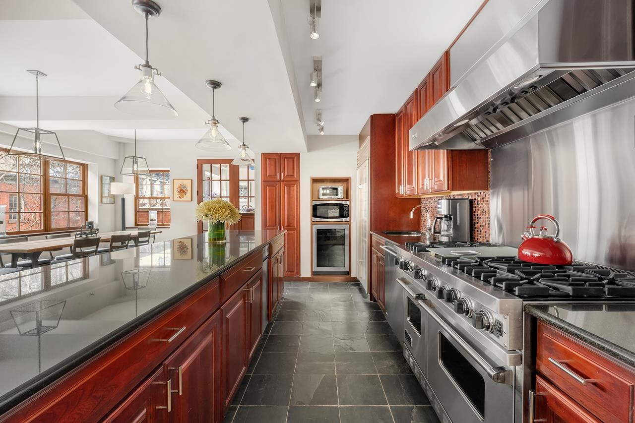 The open chef’s kitchen boasts 6 burners Viking professional range, Subzero refrigerator, Wine Cooler and a large island. The dining area offers unlimited seating.