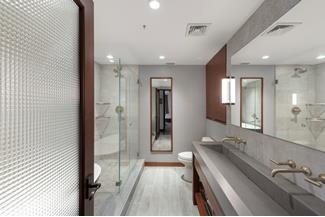 An over-sized corner master suite with private 200 sf terrace, and en-suite sleek master bathroom that offers steam-stall shower, soaking tub, and double sink.