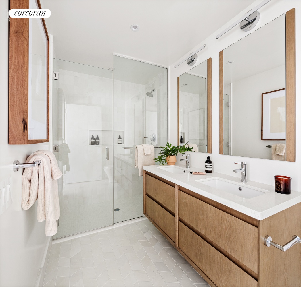 At the top of 601 Baltic, Residence 8 is a two-bedroom, two-bath residence, with two exposures. The interior offers a blend of sophistication and functionality with 6" White Oak flooring. Kitchens are customized with wood cabinetry and feature white quartzite countertops with a bond cotton gloss tile backsplash. Discerning chefs will appreciate the integrated appliance package by Fisher and Paykel and Miele.