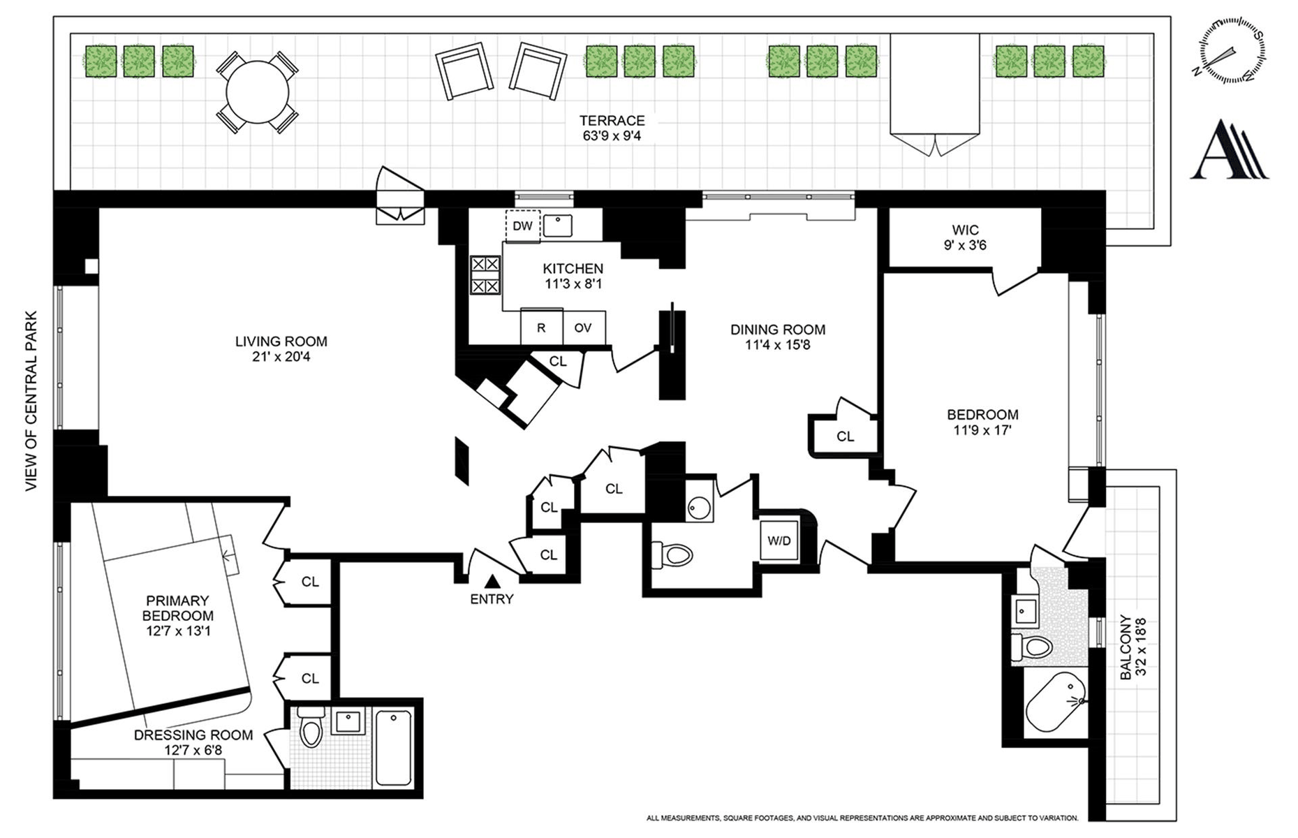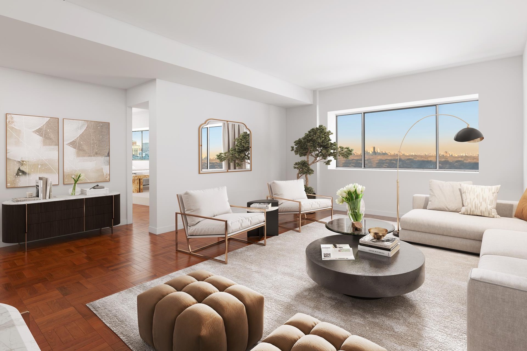 Opening from a dramatically angled foyer, the spacious living room boasts 8'9 ceilings and a stunning view of Central Park and the classic towers of Upper Fifth Avenue. The amazing 596 sq. ft. terrace runs the entire north-south length of the apartment and provides ample space for gardening and alfresco dining as well as continuing the Central Park views. The kitchen awaits an update to provide everything necessary for entertaining while the dining room is a cheerful space awash with light.