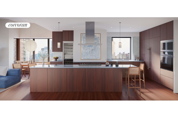 The residence occupies the entire top two floors (floors six and seven) of this new boutique-scale condominium. The living and entertaining spaces are located on the upper level, where from the moment you enter the residence, you are greeted by panoramic views of the midtown skyline. The living room is encased in floor-to-ceiling windows looking out onto a 1,000+ Sq. Ft. wrap-around terrace. A double-sided gas fireplace separates the living room from the formal dinning room, and while these spaces were designed to welcome-in the views and natural light, they were also designed to include expansive wall plains to allow for installation of large format artwork or for displaying entire collections.