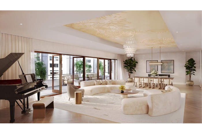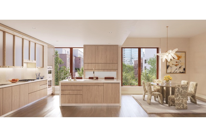 Residence 6A is a duplex 5,383 square foot 5 bedroom, 5.5 bath home with a 317 square foot terrace, with beautifully proportioned rooms and east and west exposures. Floor-to-ceiling windows from Italy allow abundant light to stream across 5 stained oak floors. The generous living and dining spaces open to the island kitchen featuring bespoke, stained ash wood cabinetry with fluted glass upper cabinets and polished Bianco ice marble countertops and backsplash. The top-of-the-line Miele appliances suite features a speed oven and gas cooking. The stainless-steel Pro-Chef sink features a Dornbracht brushed champagne faucet with a pull-down spray. This home features a Sub-Zero wine refrigerator.