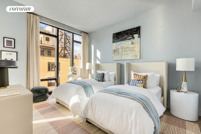 The southeast-facing primary bedroom boasts ample closet space, an en-suite bathroom elegantly ornamented with Bianco Dolomiti and Calacatta Gold marble, Toto Neorest water closets, and a soaking tub. The secondary bathroom is embellished with Italian custom-crafted lacquer wood vanities, honed cloudy mist marble floors and shower walls, glacier white Corian countertops with integral sinks, and Duravit water closets. Waterworks fixtures are throughout. Residence features include 5" solid oak plank quartered and rifted flooring, 4 pipe HVAC for year-round climate control.