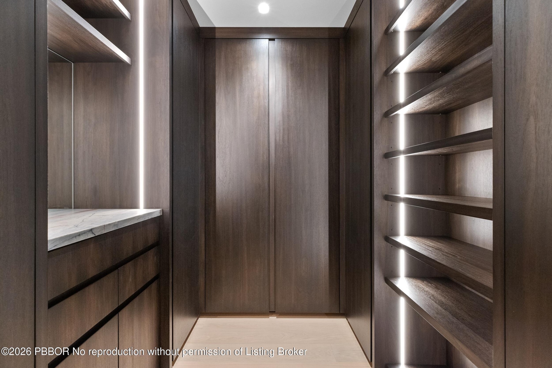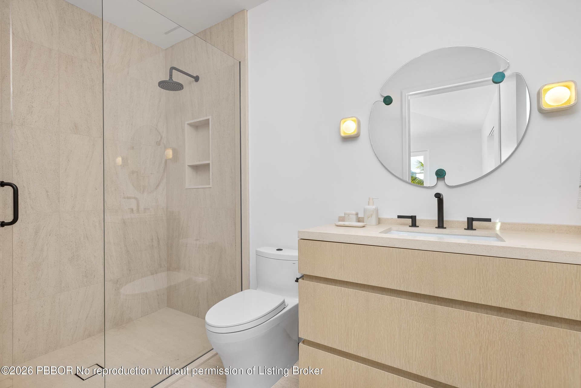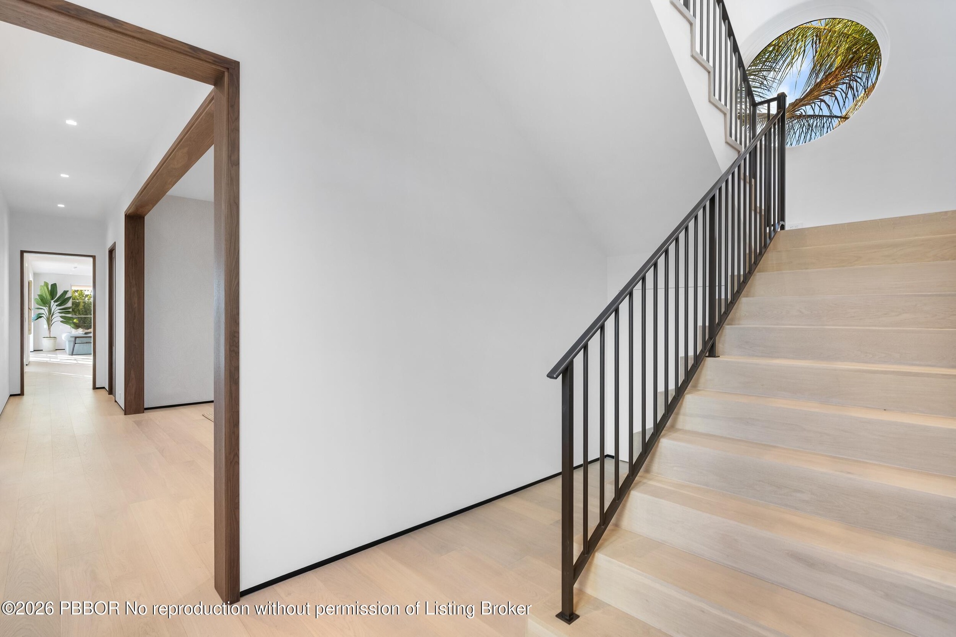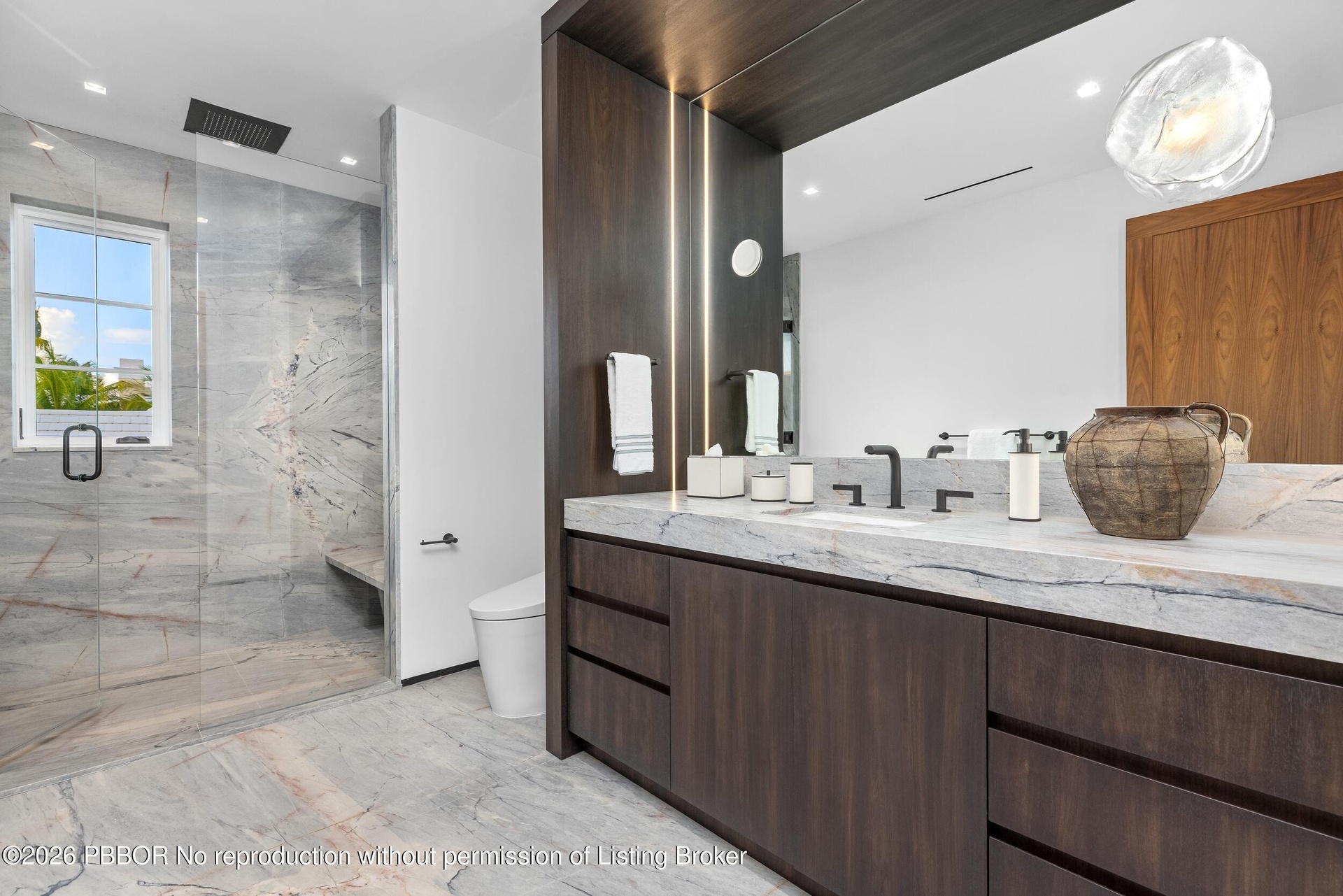 An elevator or staircase takes you to the second floor, where a beautiful landing area opens to an oversized terrace. The crown jewel of this level is the primary suite, which includes two large walk-in closets and two luxurious bathrooms one with a separate soaking tub and Vanilla Onyx stone finishes, and the other with Grigio Collemandina marble. The primary suite's private terrace faces west, offering breathtaking sunset views over the Intracoastal.
