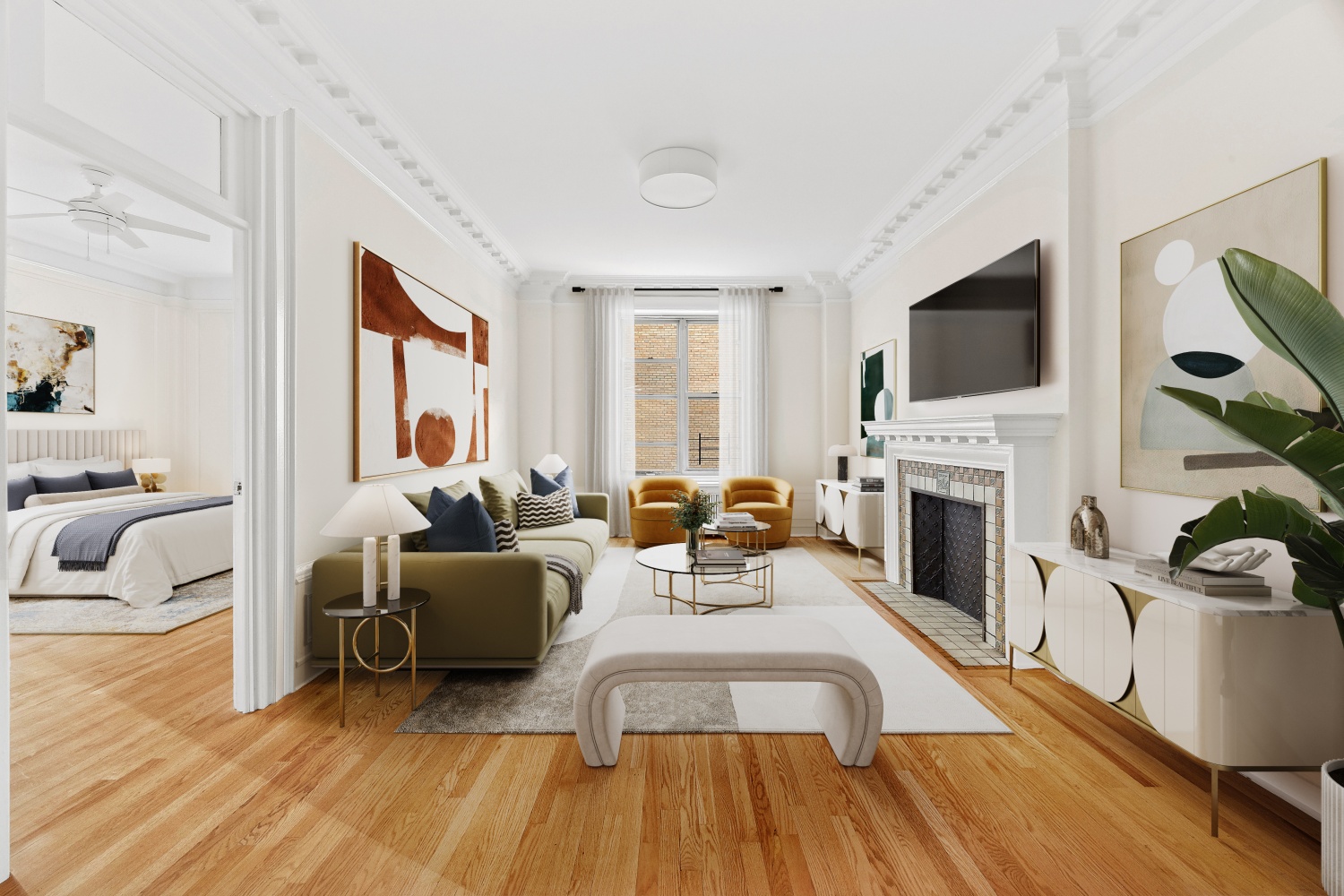 The pre-war charm shines through in the meticulously preserved original details, such as the intricate crown moldings, a striking decorative fireplace, and classic glass-paneled French doors that create an open, airy feel while maintaining a sense of refinement. These details, rarely found today, set this home apart, evoking the grandeur of a bygone era.