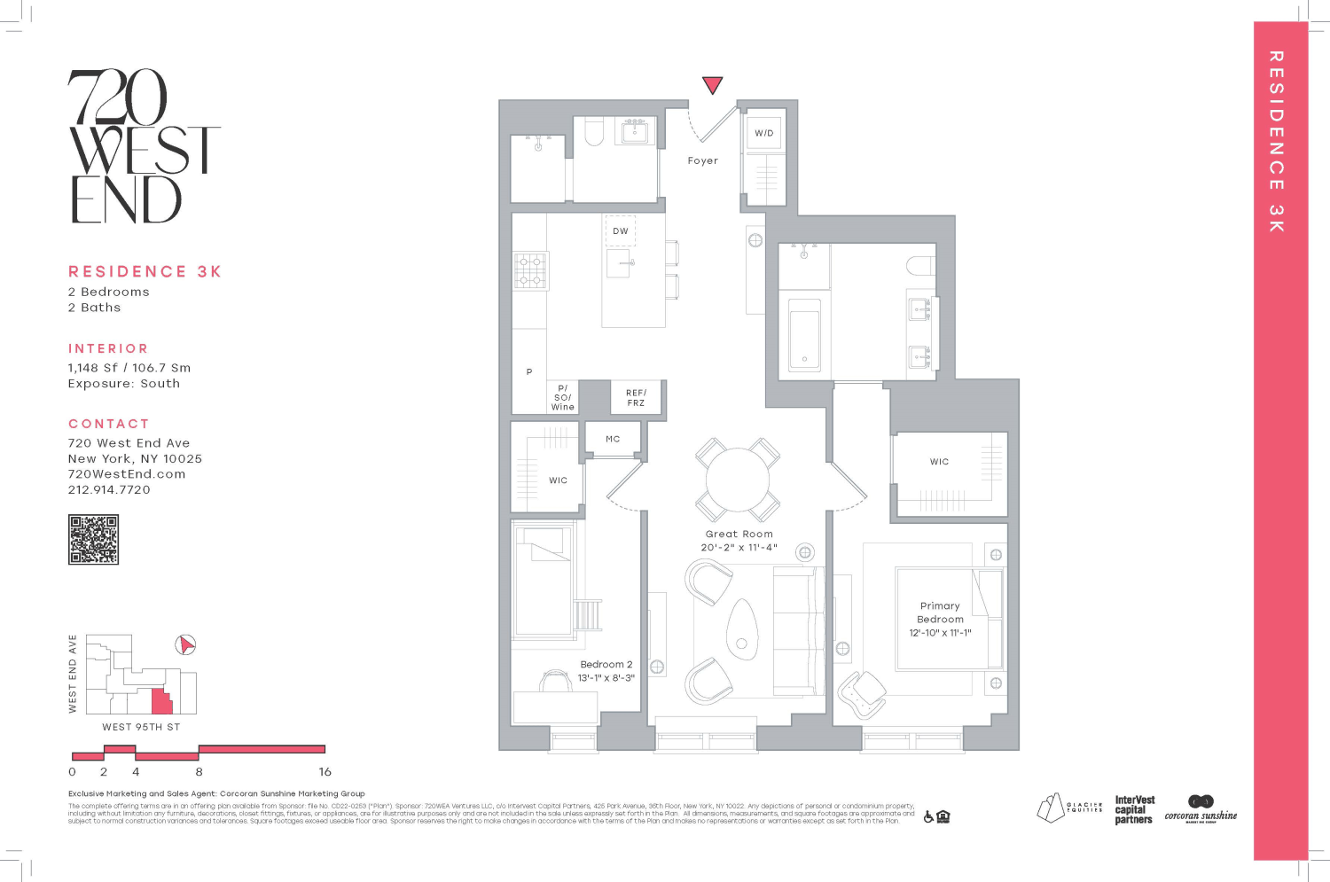 Designed by renowned architect and designer Thomas Juul Hansen, Residence 3K is a premium south facing two-bedroom, two-bathroom with powder room overlooking the tree-lined streets of the Upper West Side. Highlighted by the timeless character of yesterday and the compelling minimalist styling, modern conveniences and technologies of tomorrow, each home at 720 West End Avenue is unique. Celebrate an abundance of natural light, and open, flowing space in each residence.
