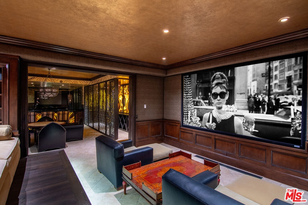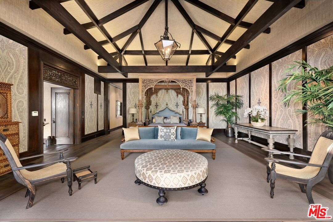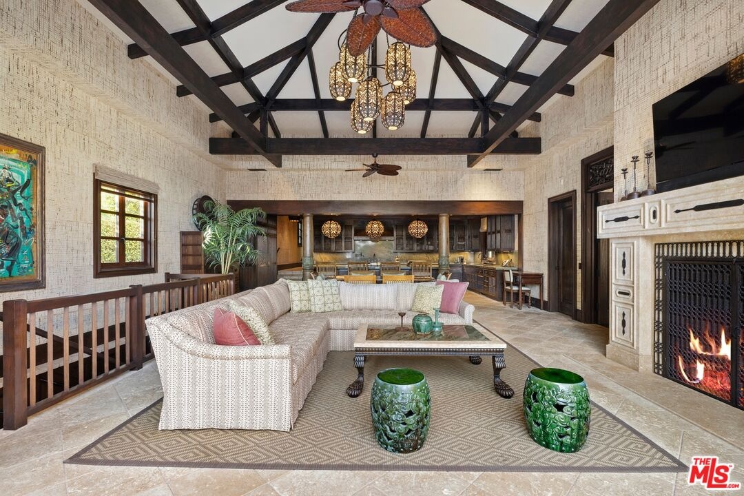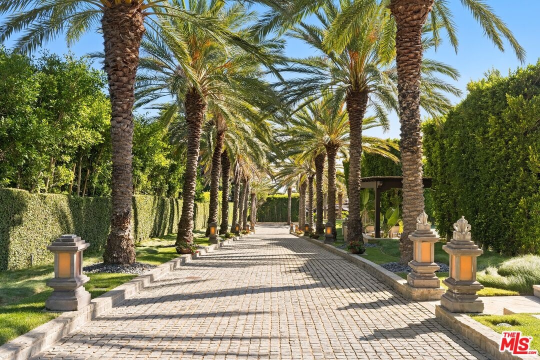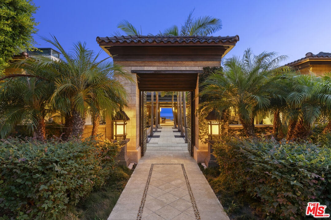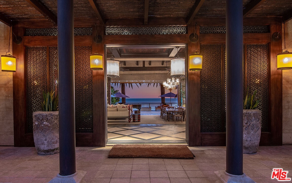 With breathtaking views, Bali-inspired design, and every contemporary comfort, this magnificent estate is a serene sanctuary for exquisite living and impressive entertaining. The private, gated property of over 1.2 acres extends from PCH to Malibu Road, perfectly landscaped and commanding expansive ocean views. A long palm-lined drive leads past a two-story, two-bedroom guesthouse, a lighted north-south tennis court and pavilion, and a fountain, waterfall, and gardens before arriving at the enormous motor court and four-car garage. A dramatic gateway and long, serene palm-lined reflecting pool lead between the wings of the U-shaped house to the gorgeous double-door entry. With interiors designed by Martyn Lawrence Bullard and stunning sight-lines to the ocean, the house is detailed with ornate wood carving, very tall beamed ceilings, wood and stone floors, and full-width exterior doors that vanish to offer seamless flow between indoors and out. The entry steps down to the formal living room, which includes a generous dining area, a pair of facing fireplaces, and a wall of glass that opens onto a roomy patio with a fireplace, stunning ocean view, and a nearby fountain and barbecue island. Adjoining the living room is a spectacular ocean-view great room that includes a family room with fireplace, dining area, and a gourmet kitchen with a huge stone-topped island with seating, deeply recessed tray ceilings, beautiful cabinetry, and a pantry. One wing of the house has two bedrooms and a laundry room. The other wing features a majestic ocean-view owner's retreat with high wood beamed ceilings, beautiful wall coverings, wood floors, and a wide glass doorway opening to a tranquil covered patio. A hallway leads to a luxurious bath, two very large closets/dressing areas, and, at the end of the hall, a resplendent Bali-inspired library/study with high coved ceilings, a wall of built-in book shelves and cabinets, a fireplace, and doors to the patio and to a private sitting area. The home's lower level features a party-perfect bar room highlighted with ornate metalwork that encloses a large wine storage area. The bar extends into a spacious tiered home projection theater. A long hallway leads to a second powder room, a changing room, and another bar, which opens to the lower patio, spa, sitting areas, and lawns, as well as the infinity ozone pool, patio, cabana, and private steps to Malibu Road and access to the beach/ocean. With Crestron electronics and full-house water filtration, this remarkable estate is a livable legacy.