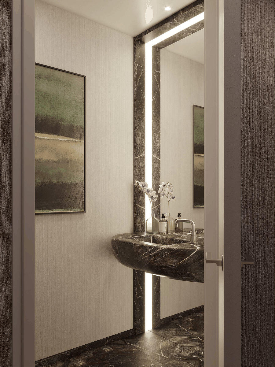 The powder room is elegantly appointed with Black and Gold Michelangelo marble sink, stone surround, flooring and base, and polished nickel Waterworks fixtures.