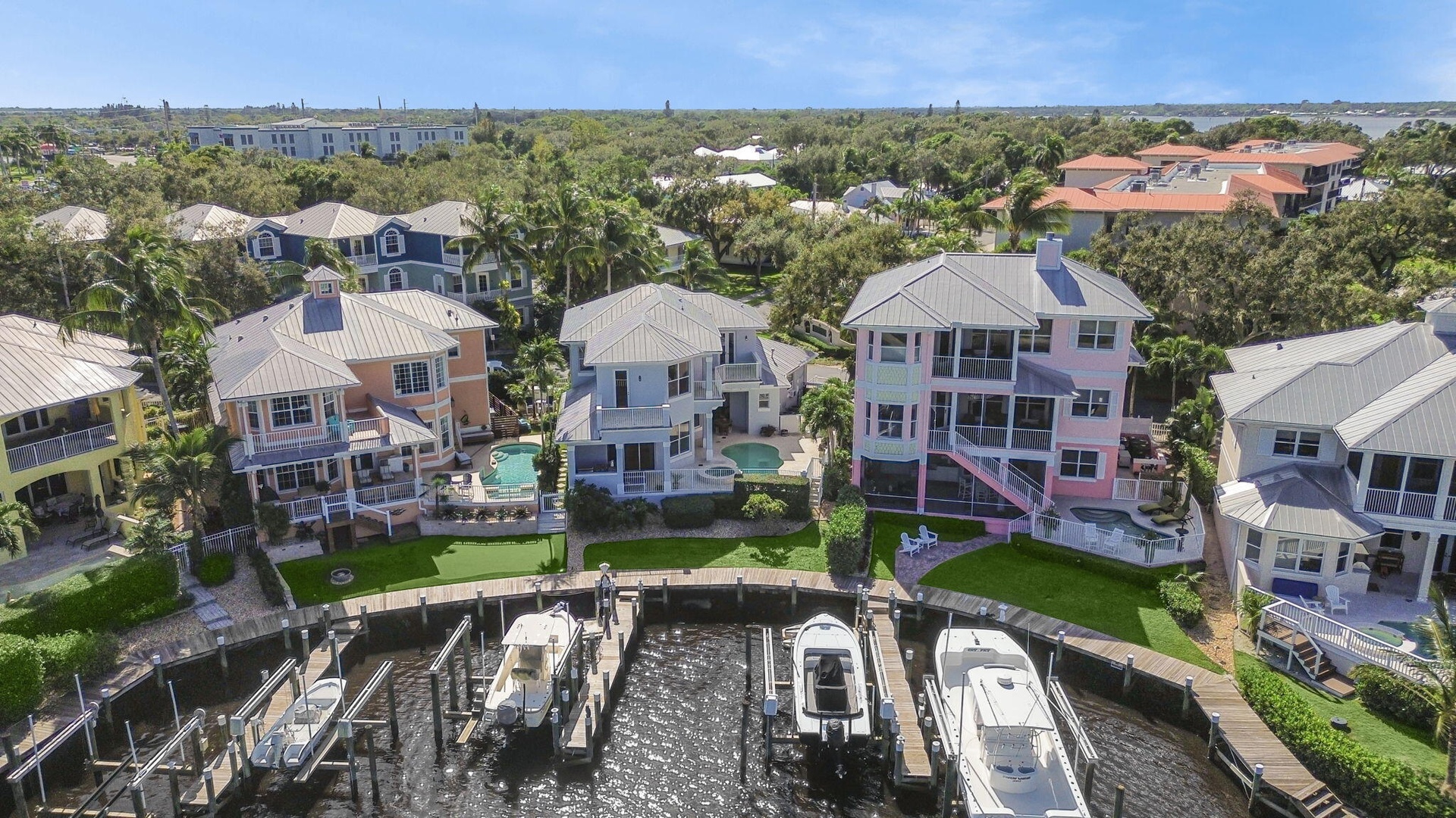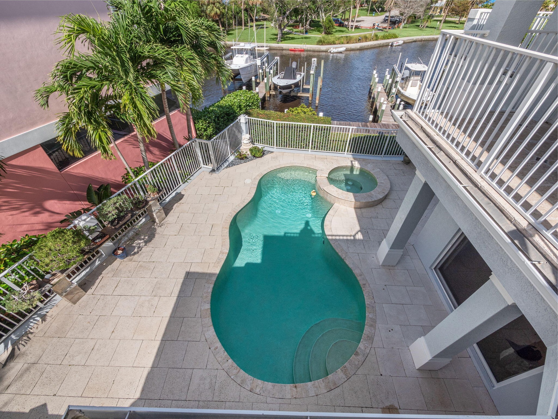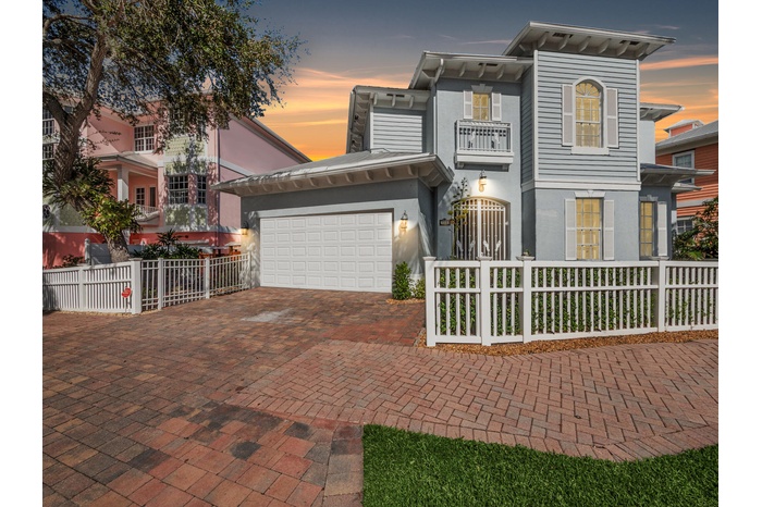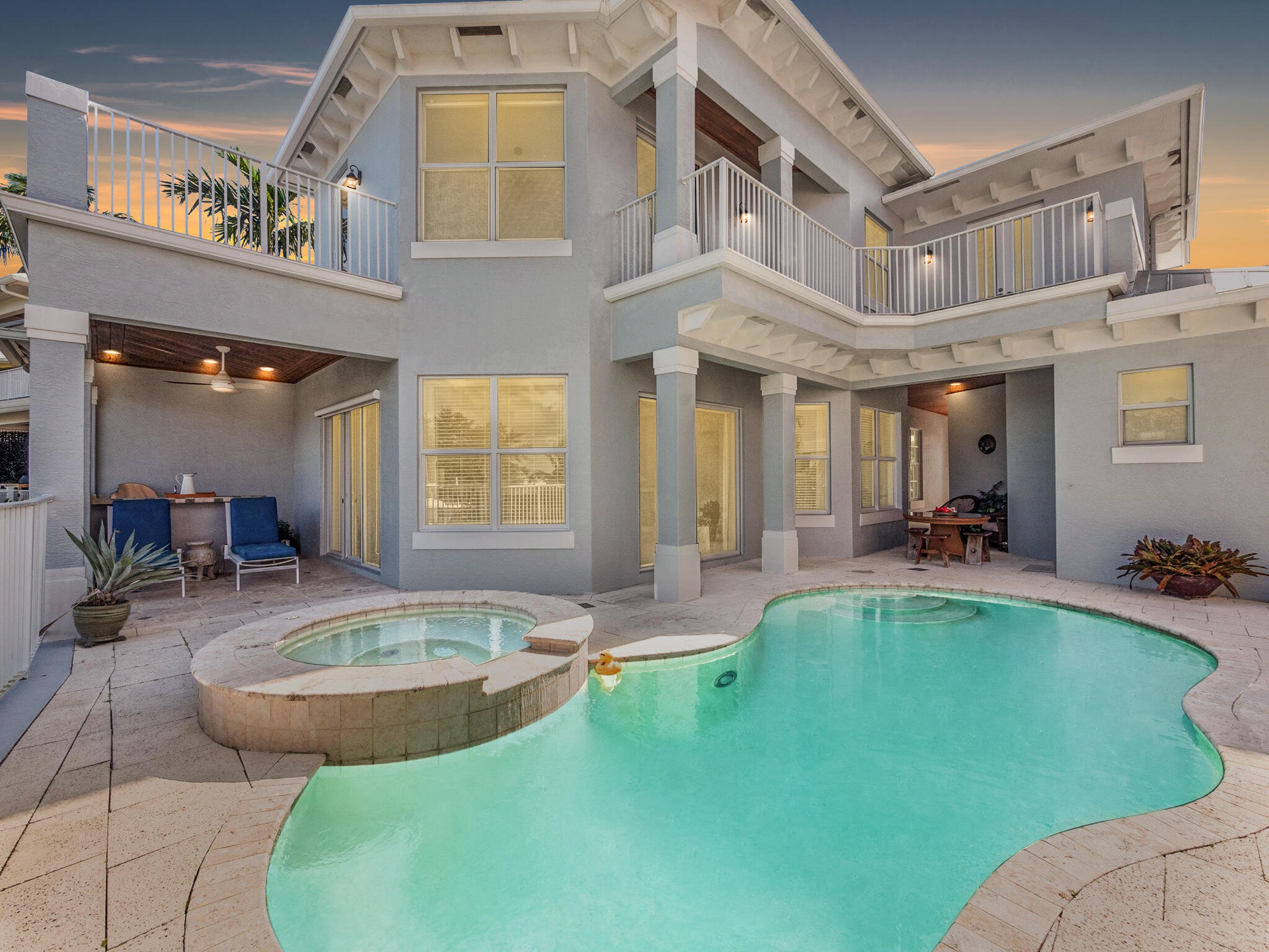 Downtown location with a private boat slip directly behind your home! This residence checks all the criteria including: CBS construction, impact windows & doors, oversized two car garage, pool with spa, outdoor kitchen with new chef's stainless grill. Inside the kitchen serves as the heart of the home, with gas stove, oversized Liebherr refrigerator & freezer. Serene downstairs office, half bathroom, & ample storage closet complete the first-floor plan. Upstairs, find the main suite with oversized walk-in closet, & wrap around balcony. Two more beds & baths compliment the upstairs living. Outside, the home shines, ample dockage with power & water available to add boat lift, protected cove location, & cabana bath. Home is part of a small, 6 luxury home association.