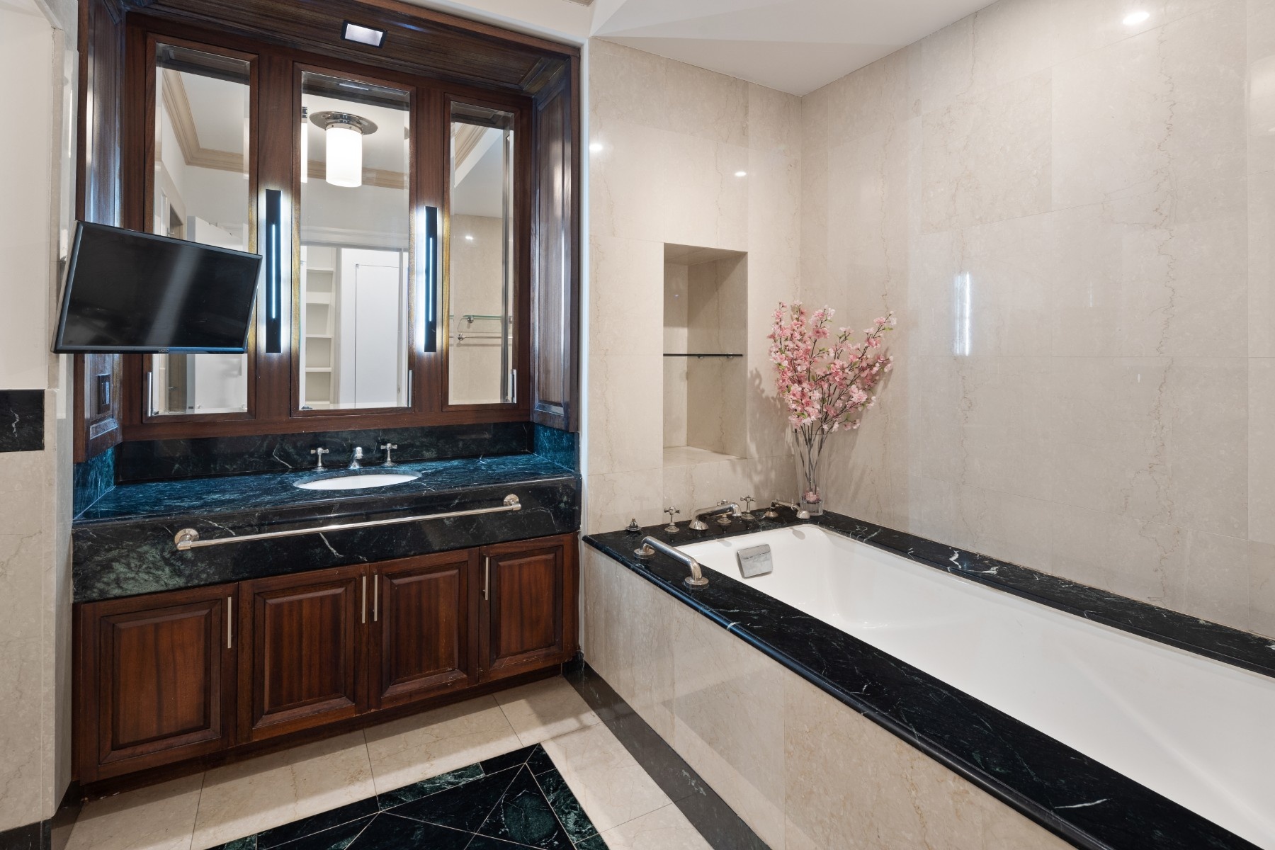 Indulge in the luxury of the famously large, hotel-like bathroom, featuring a 6-foot marble bath, oversized soaking tub, and separate shower, designed to provide a spa-like experience within the comfort of your home.