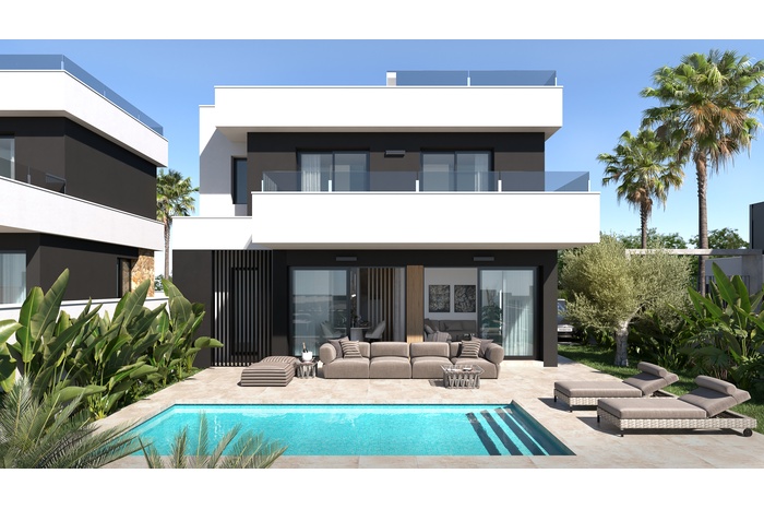 Villas: Independent properties with three bedrooms and three bathrooms, available in one- or two-story layouts. Each villa includes a private pool, a solarium, and parking within the plot. Optional basements are also available.