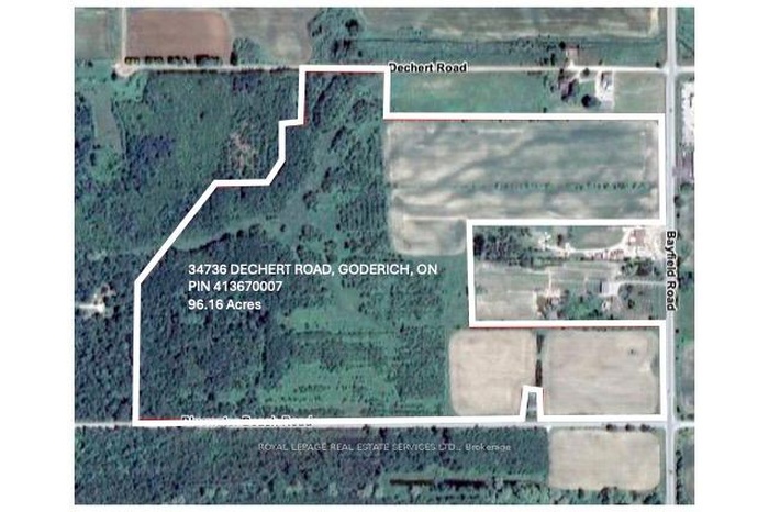 DescriptionSubject Lands are located within the Settlement Area of the Municipality of Central Huron-the Township of Goderich. The Subject Lands have frontage on Highway 21 to the east, Dechert Road to the north, and Bluewater Beach Road to the south, and are currently occupied by agricultural and open space/natural environment uses. There are currently no structures on the Lands. The Subject Lands are located adjacent to existing built-up areas to the east and the west, and a proposed mixed-use development is contemplated immediately north. The current owner has undertaken significant planning, the earlier proposed development included three commercial blocks along the Highway 21 frontage, medium density townhouses and semi-detached dwellings immediately west of the commercial blocks, and single-detached dwellings on the western portion of the Subject Lands adjacent to the environmental protection area. Seller will consider financing or JV for a qualified buyer at Seller's sole discretion. **EXTRAS** In addition to an OPA & ZBA, a Draft Plan of Subdivision application was submitted to create development parcels and blocks, public streets, a public park, an environmental protection area, and a storm water management area.