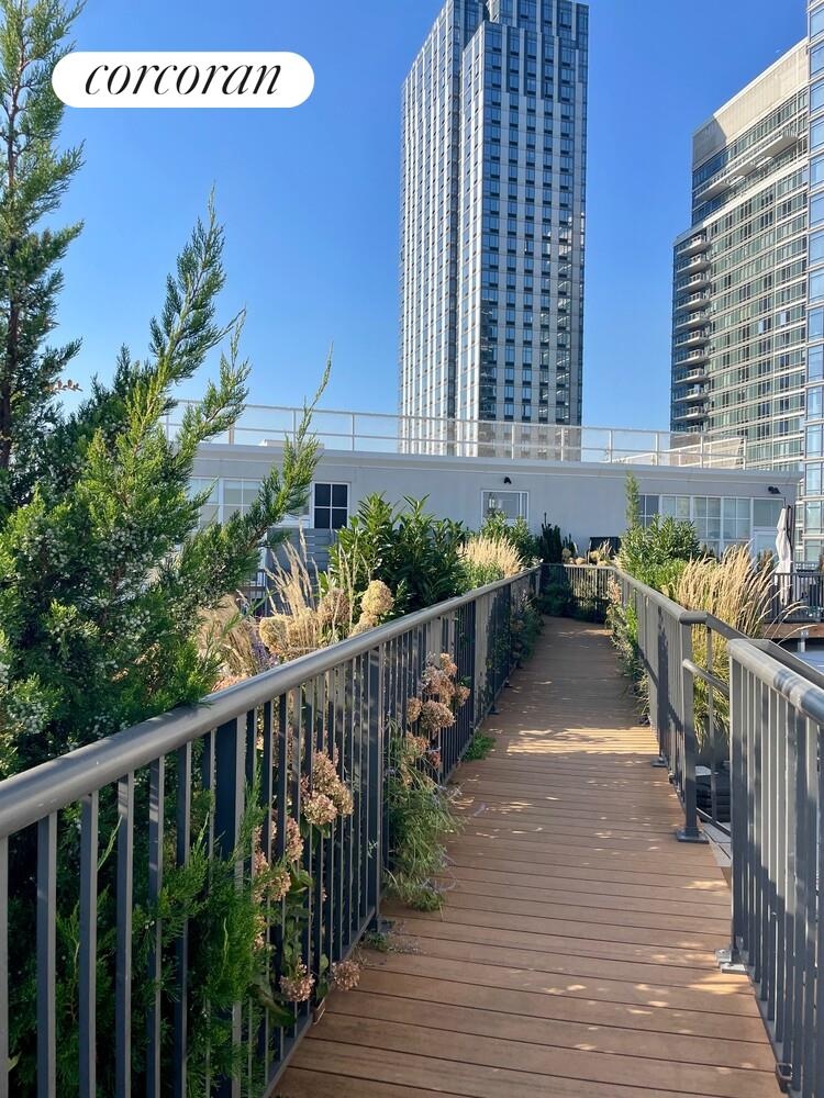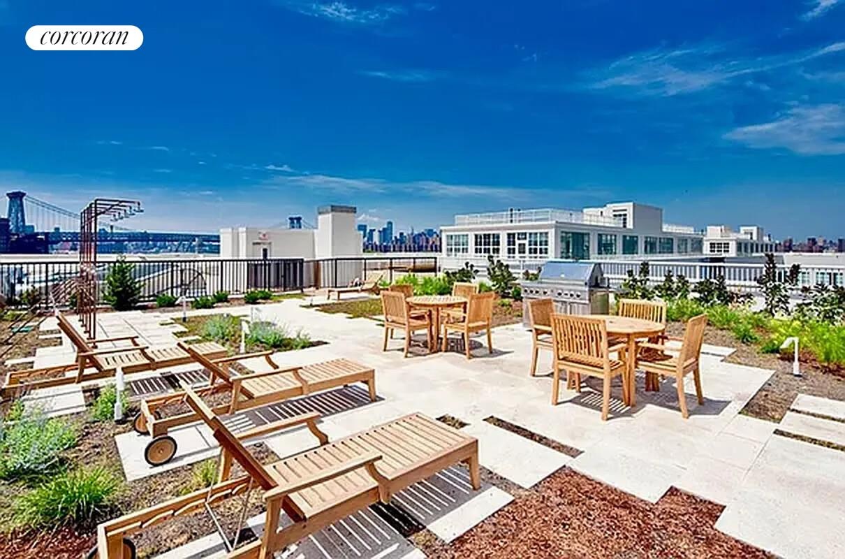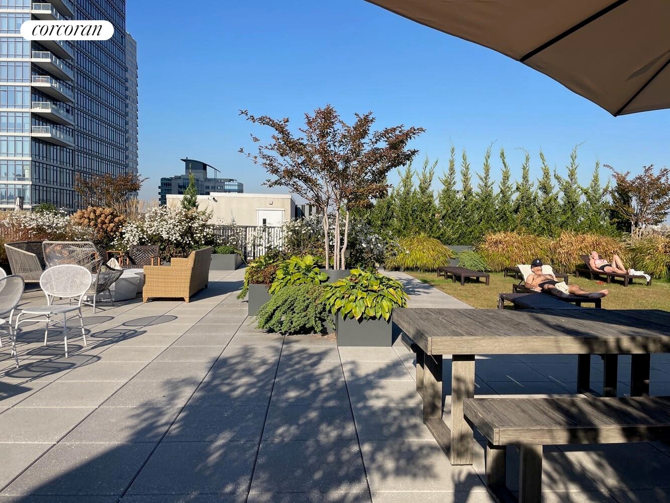 A newly renovated/landscaped roof deck with lounge seating, BBQs, and dining areas