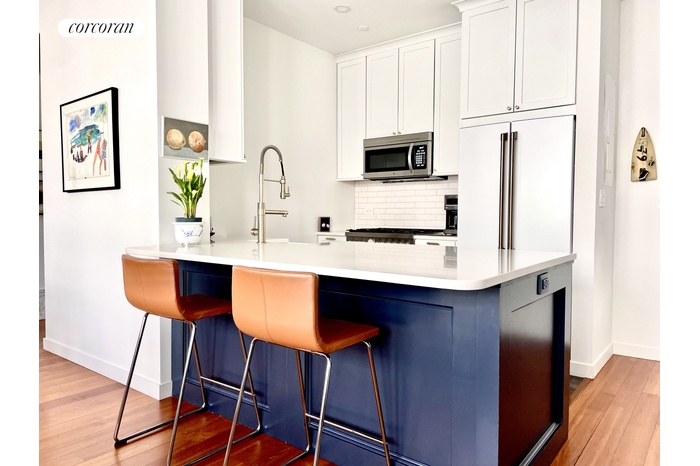 The 10.7-foot ceilings enhance the open-concept living space. The chef's kitchen has been beautifully renovated with custom cabinetry, quartz countertops, and top-of-the-line appliances, including a Cafe Counter-Depth French-Door Refrigerator, Bertazzoni Five-Burner Stove, and 30" Bertazzoni Microwave, Asko dishwasher, LG washer/dryer combo; this is the ideal layout for the discerning chef. A peninsula island with counter seating makes this kitchen an entertainer's dream, seamlessly flowing into the spacious living and dining area.