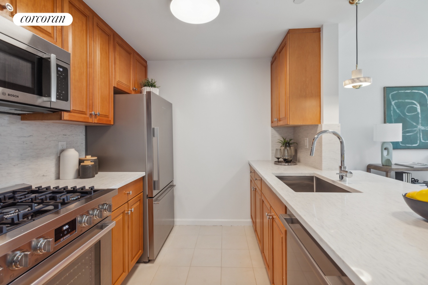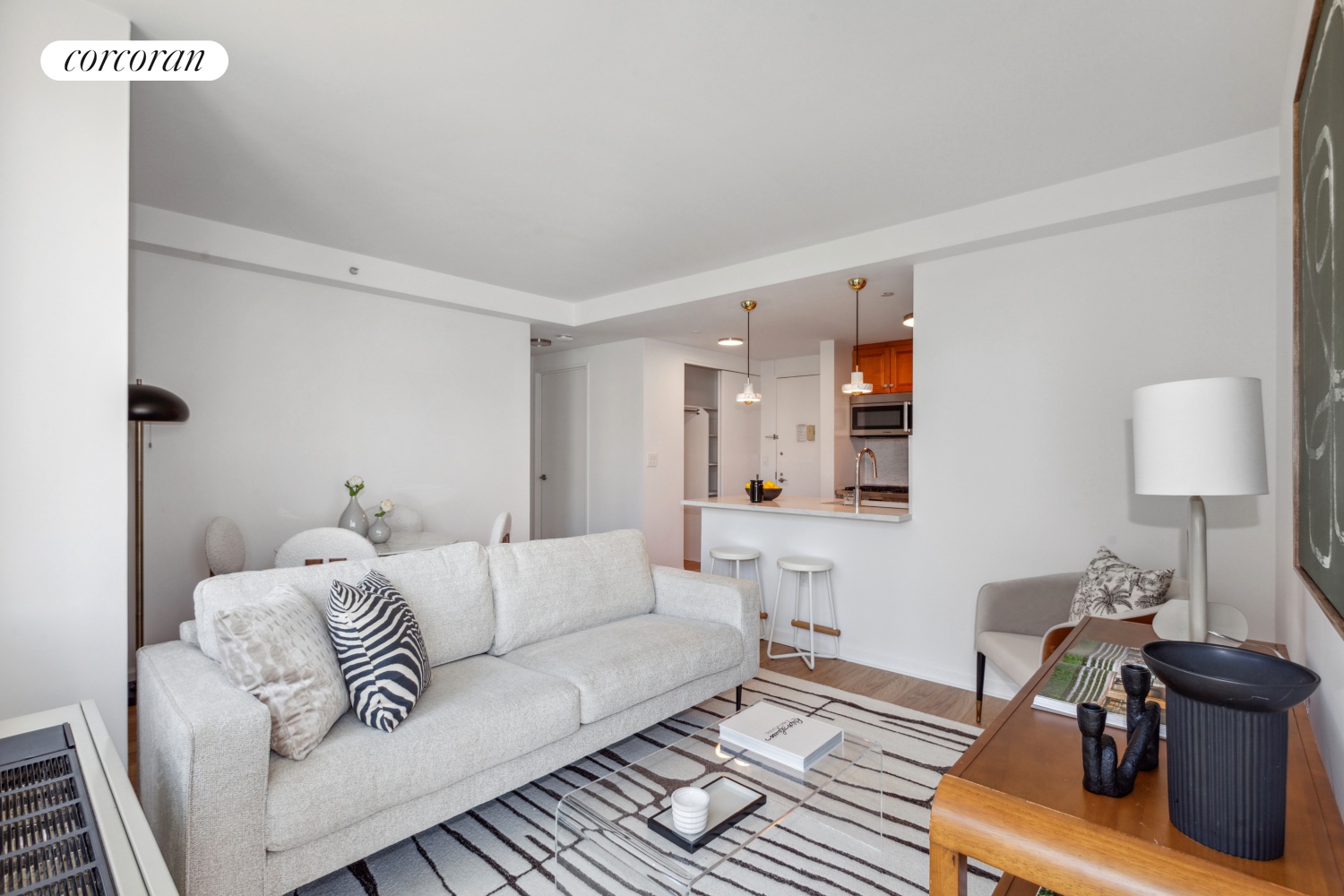As you step inside, a well-appointed kitchen with full-size stainless steel appliances greets you on the left, while a spacious entry closet sits conveniently on the right. The open-concept living and dining area is framed by striking corner floor-to-ceiling windows, bathing the space in natural light and offering breathtaking views of the Manhattan skyline and the East River.