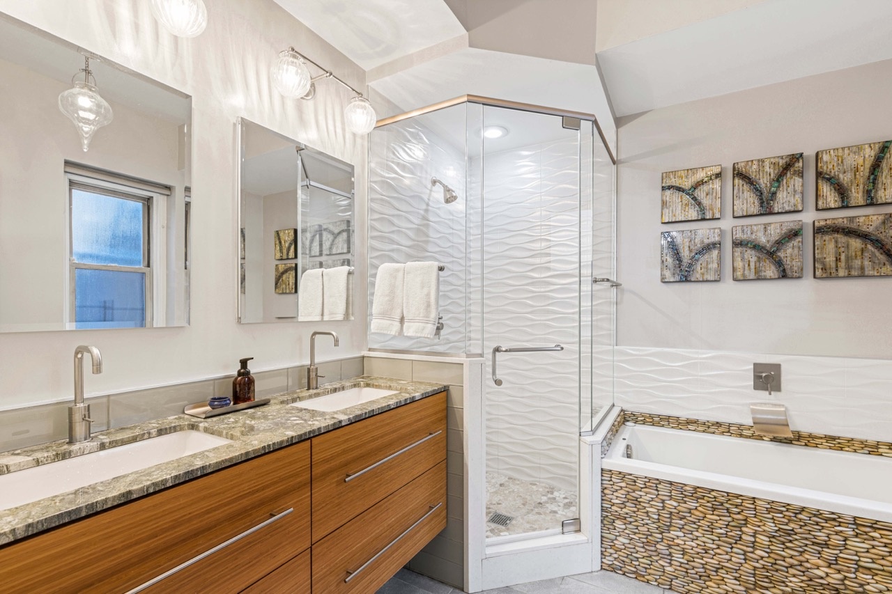 They share a large, windowed bathroom with a stall shower, double sink and a soaking tub. A third bedroom or den is situated along the same hallway and is currently configured as a home office.