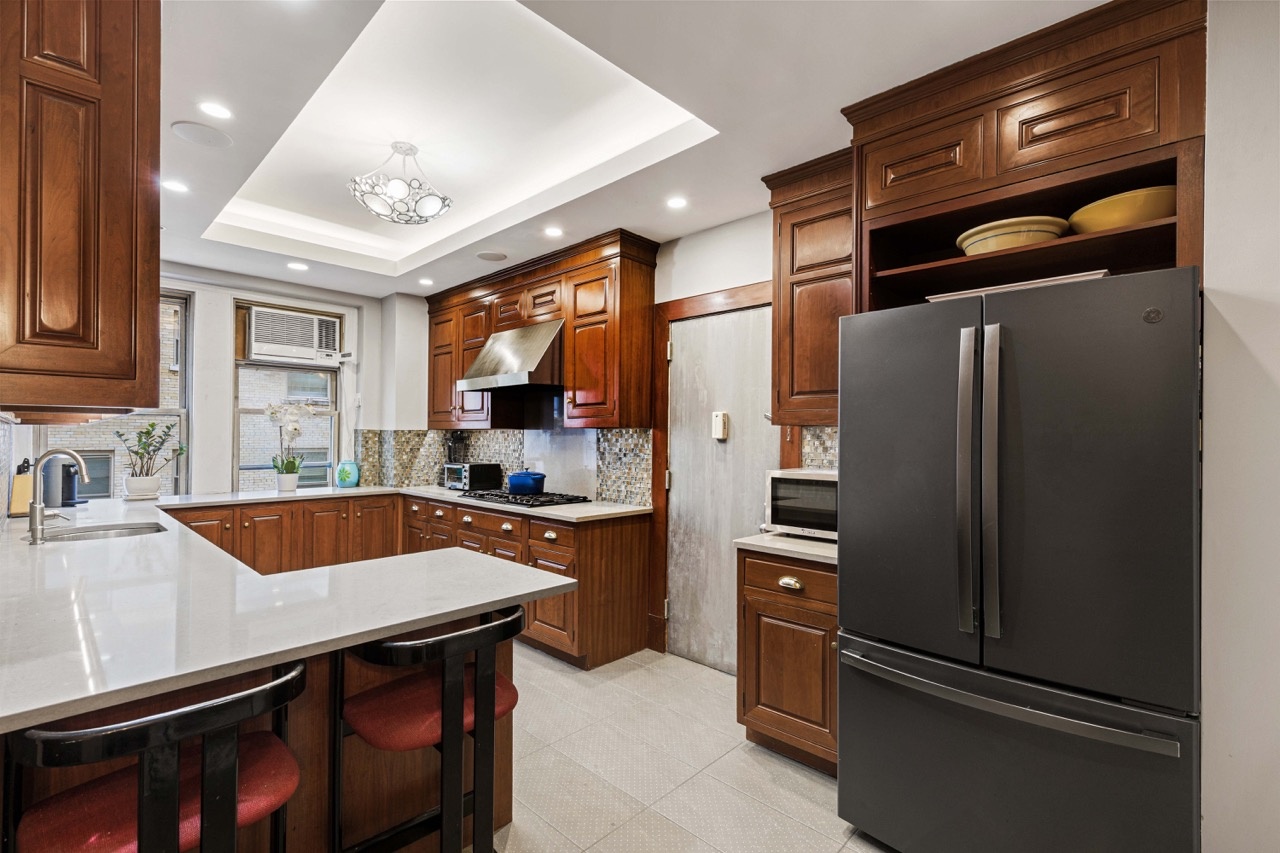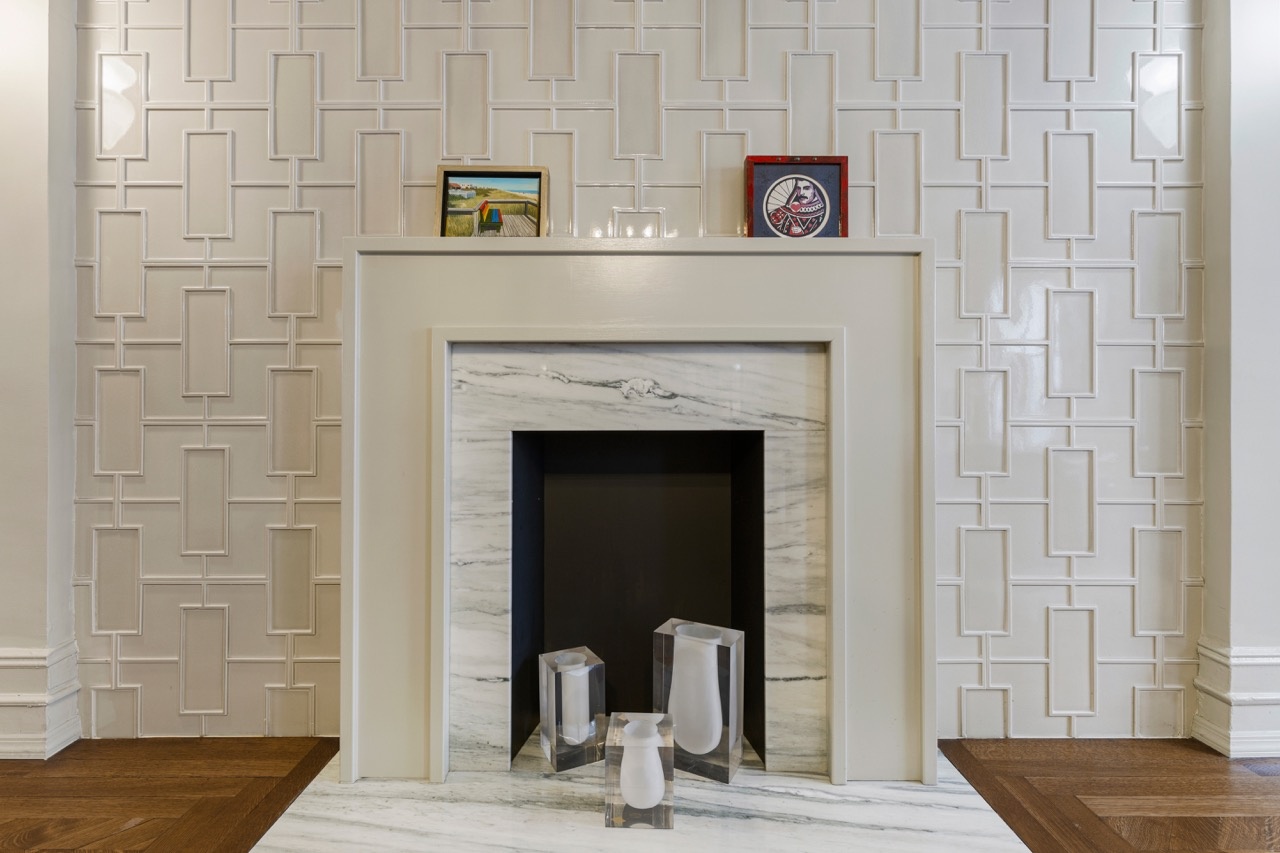 Enter through a semi-private landing into a grand Gallery, with major rooms oriented to the South, West, and North. To the left of the Gallery, an oversized Living Room with a decorative fireplace, adorned with stunning ceramic and marble tiles, faces South over wide, tree-lined 86th Street, offering warmth and elegance.