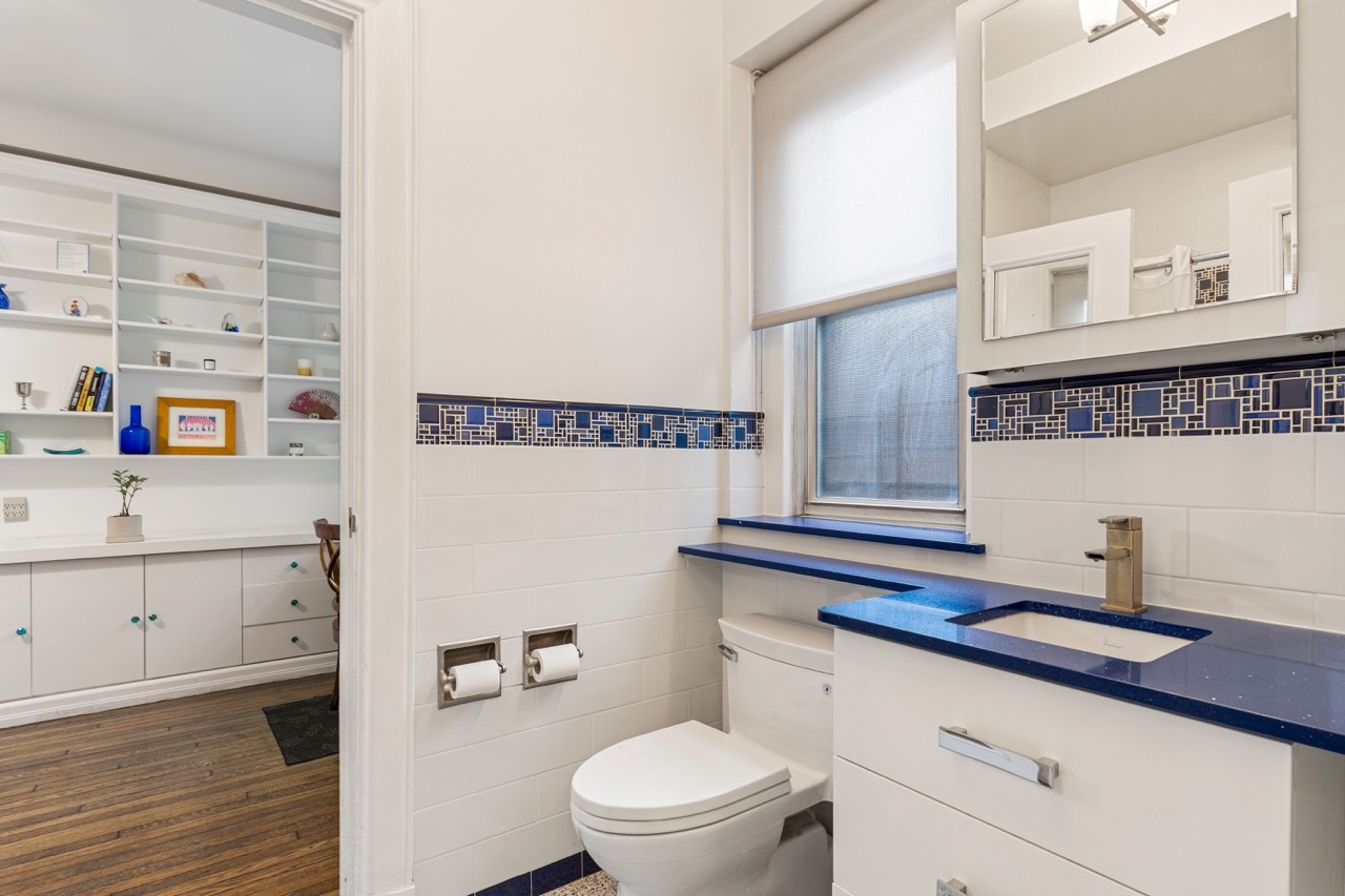 Down the hallway, two more bedrooms share a full windowed bathroom. One bedroom features double exposures (North and West), while the other faces West. Both include good closets and built-in storage, making them ideal for flexible living arrangements.
