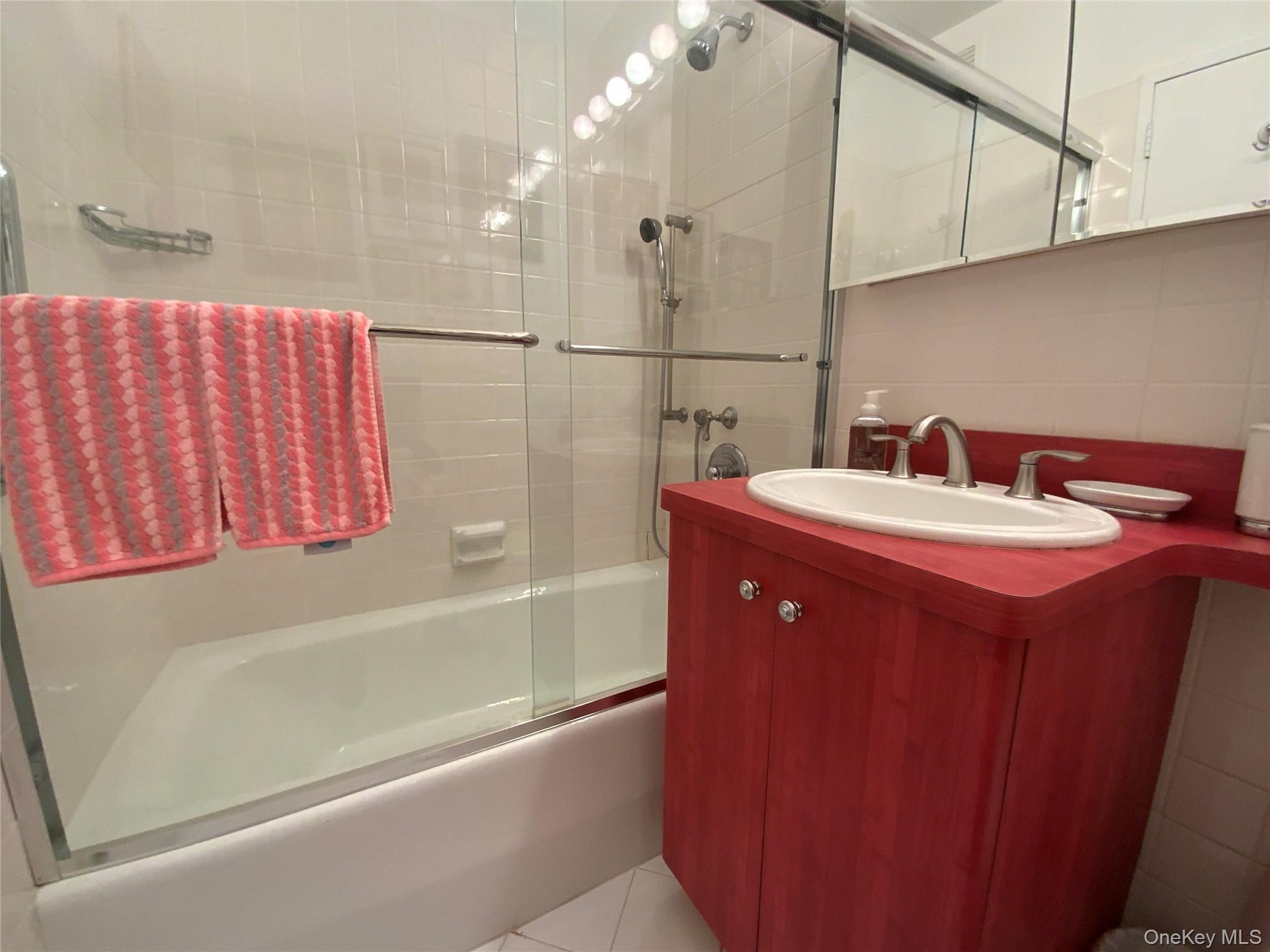 - Bathroom with vanity, enclosed tub / shower combo, tasteful backsplash, light tile patterned floors, and tile walls