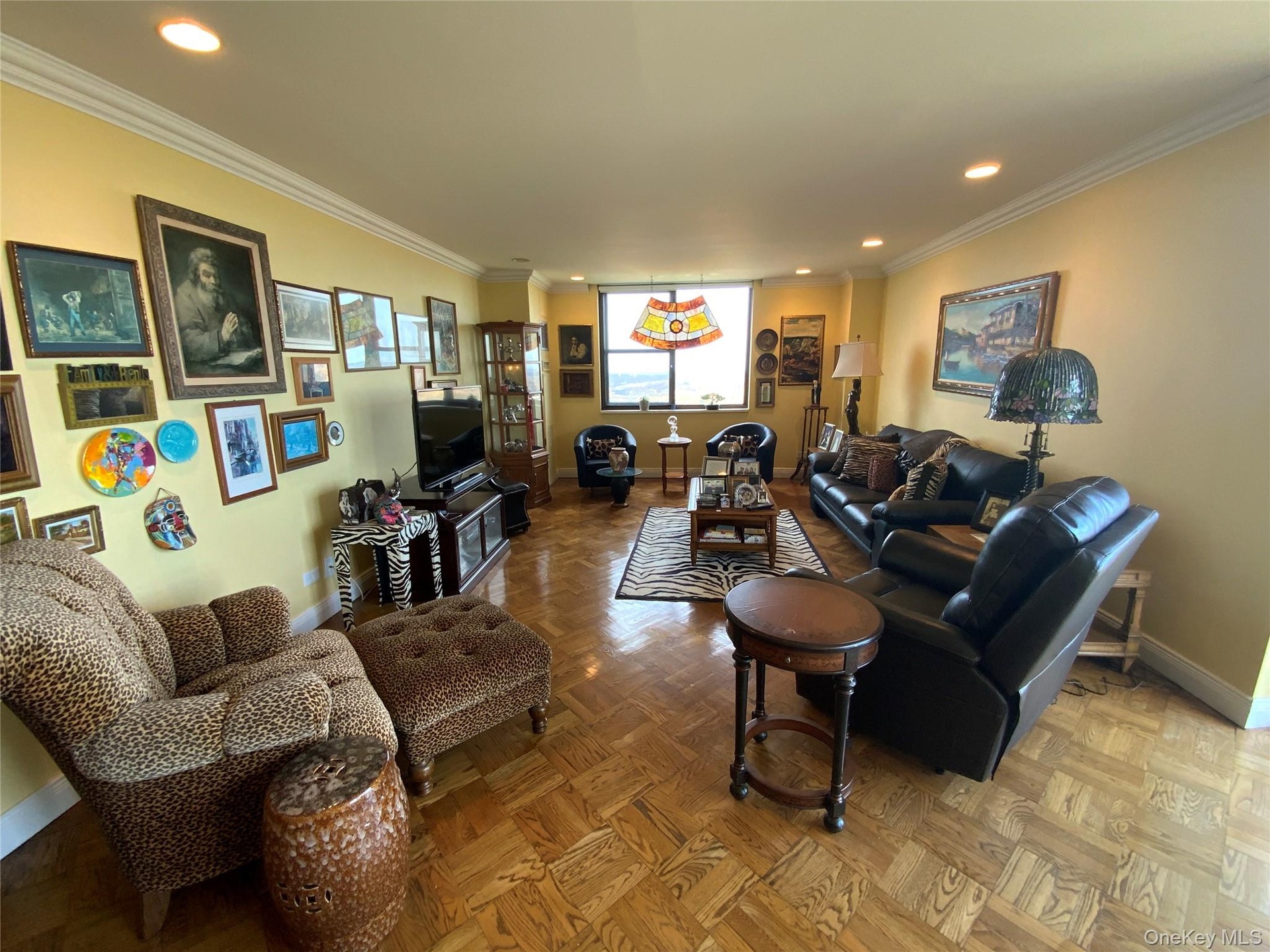 - Living area featuring ornamental molding, recessed lighting, and expansive windows