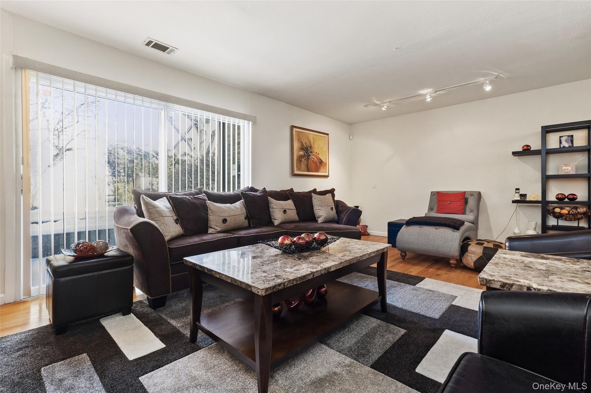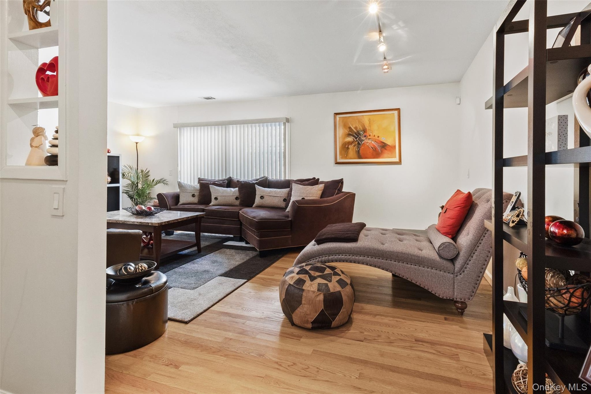 - Living room featuring rail lighting and hardwood / wood-style floors