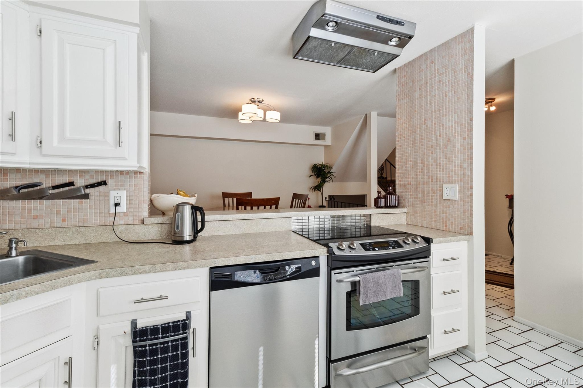 - Kitchen with white cabinetry, appliances with stainless steel finishes, kitchen peninsula, and tasteful backsplash