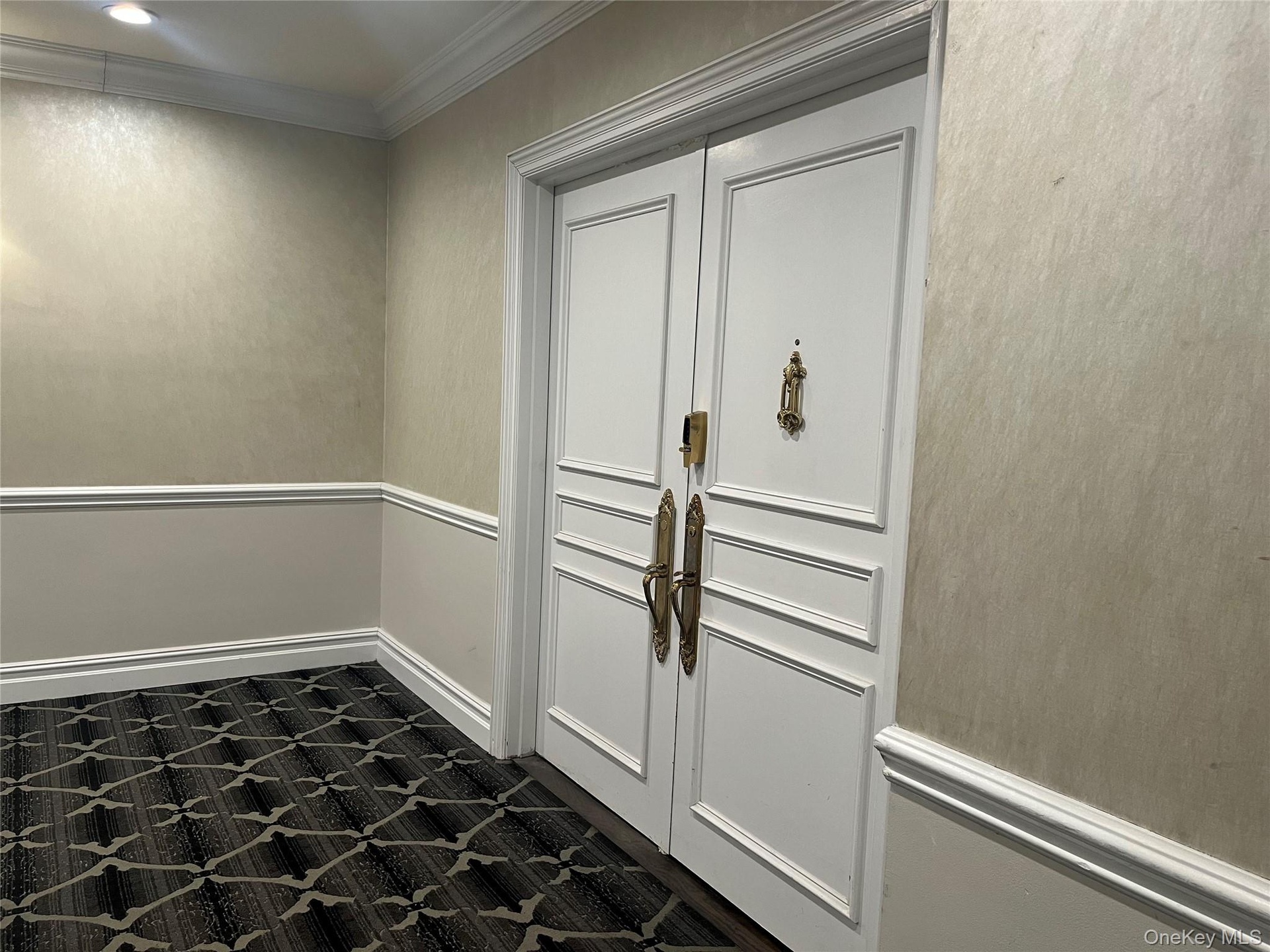 - Corridor with dark hardwood / wood-style flooring and ornamental molding