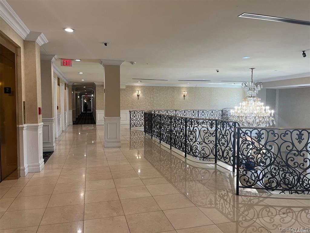 - Hallway featuring crown molding, an inviting chandelier, decorative columns, and light tile patterned floors