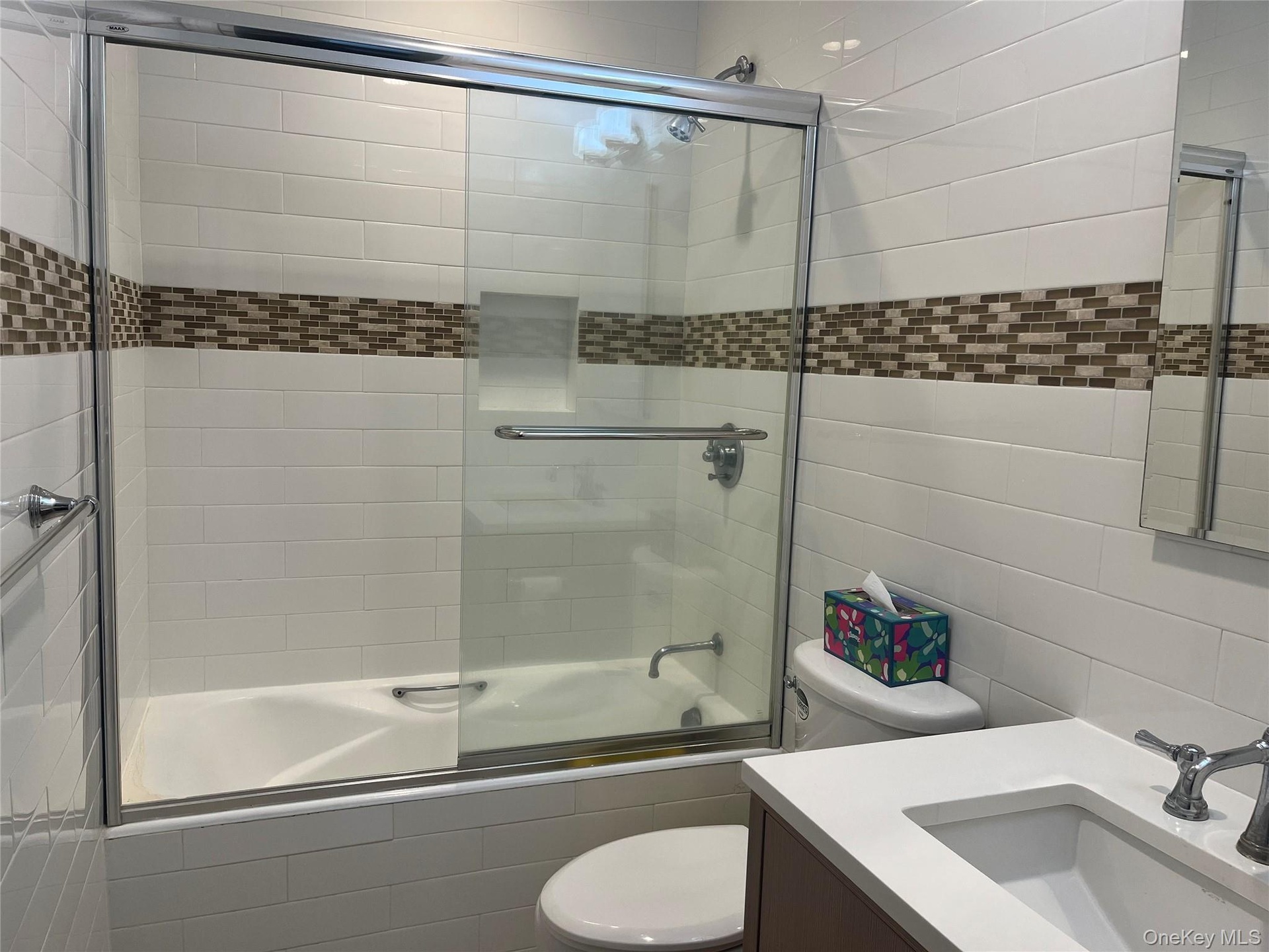 - Full bathroom with vanity, combined bath / shower with glass door, tile walls, and toilet
