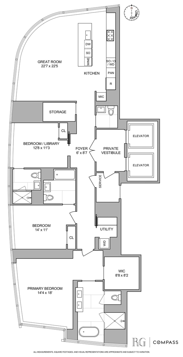 Exit the elevator onto your private landing, where double doors open to an elegant entry foyer. From here, enter into a spectacular great room with ample space for both living and dining. The open kitchen is a chef’s dream, featuring a 36" Sub-Zero refrigerator, a 5-burner Wolf cooktop with a fully vented hood, a Wolf oven with a plate warmer, and a Calacatta Borghini marble island with book-matched waterfall edges, countertop, and backsplash. Custom Dornbracht fixtures in a soft black matte finish add a sleek, modern touch.
