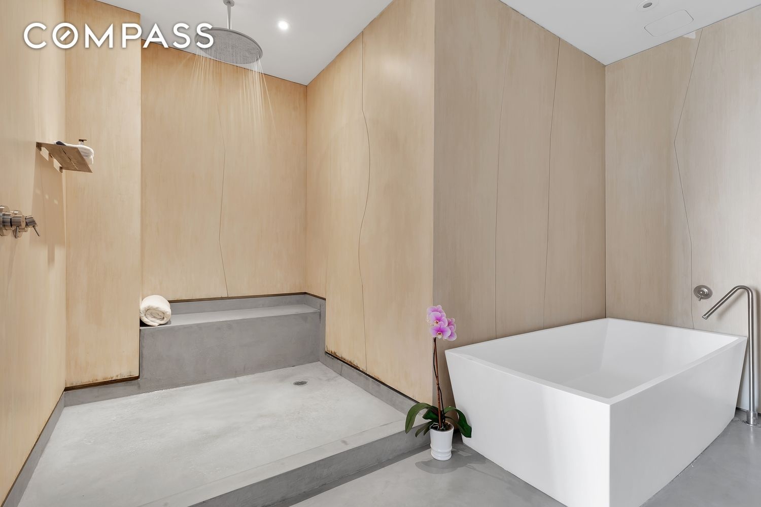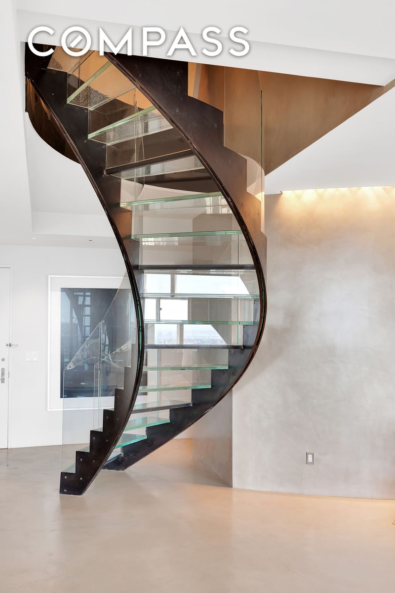 The 50th floor is dedicated to private living spaces. The expansive primary suite spans nearly 500 square feet, offering two enormous walk-in closets, a home office, and a spa-like bathroom with double sinks, a stall shower, and a soaking tub. Three additional bedrooms include one en suite and two that share a generously sized bathroom. A fifth bedroom/media room with an en suite bath is located on the 49th floor. A sculptural steel and glass staircase connects the levels, further enhancing the modern design.