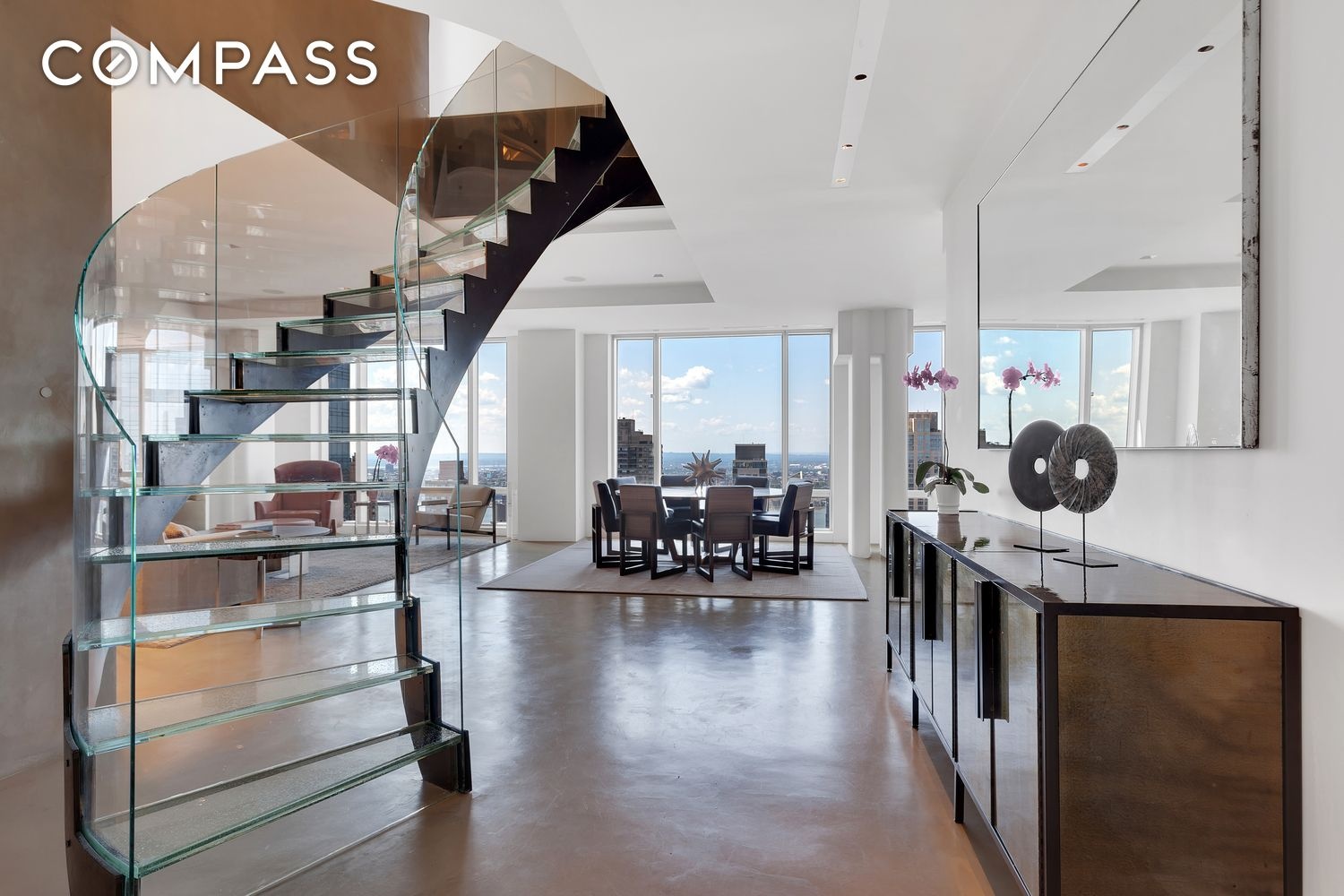 Experience the rare opportunity to own the only duplex apartment at One Central Park West. Situated on the 49th and 50th floors—the building's penthouse level—this exceptional residence spans 4,266 square feet, offering dramatic west-facing views of the city skyline, the shimmering Hudson River, the New Jersey horizon, and picture-perfect sunsets. The home has been meticulously renovated, blending a downtown loft aesthetic with the sophistication of Upper West Side luxury.