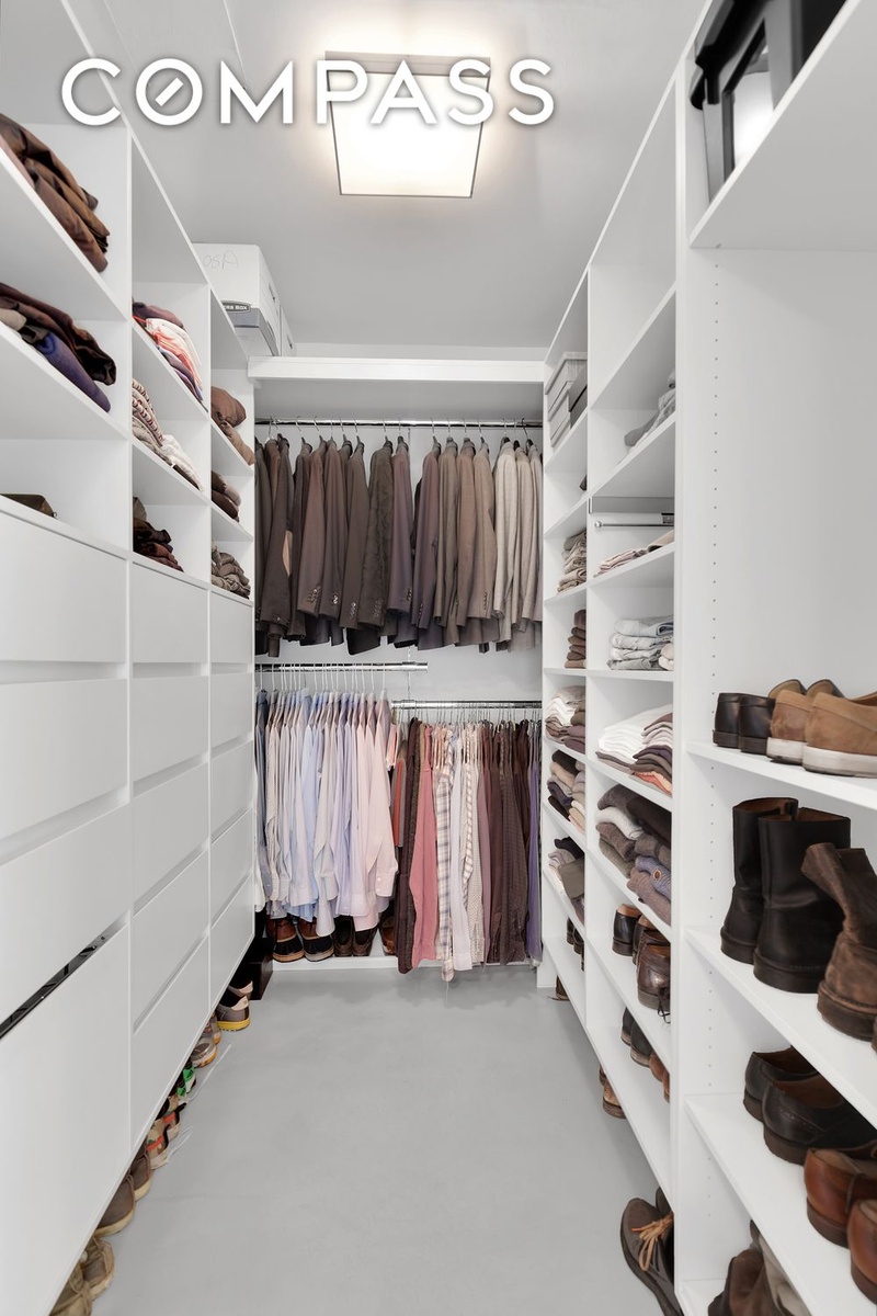 The entrance on the 49th floor opens to a sunlit expanse of living and dining areas with high ceilings, perfect for entertaining on a grand scale. Polished concrete floors throughout lend a chic, modern appeal. The recently renovated kitchen features a porcelain-clad island with stain-resistant countertops and backsplash, Gaggenau and Wolf appliances, and clever cabinetry designed to conceal appliances for a sleek finish.