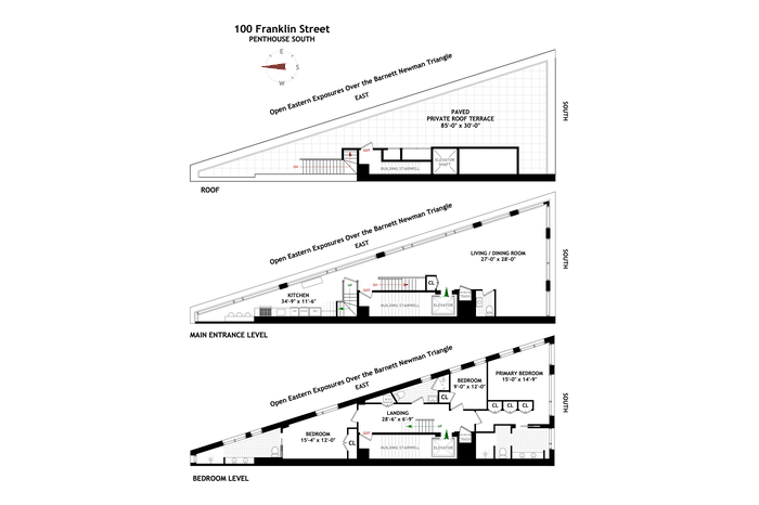 Enter onto the main level of the home via a private key locked elevator. Unobstructed views greet you as you enter the massive east and south facing living / dining room providing a bright and welcoming area for entertaining. Walk past the spacious powder room to the northern end of the apartment where you will find the brightest eat-in kitchen you are likely to ever see. Designed with custom shelving and cabinetry, marble countertops, stainless steel appliances and a vented hood. This unique spacious kitchen is flooded with light and is topped off with a versatile breakfast bar with seating for 3. All this while being surrounded by open views overlooking 6th Avenue and the Barnett Newman Triangle.