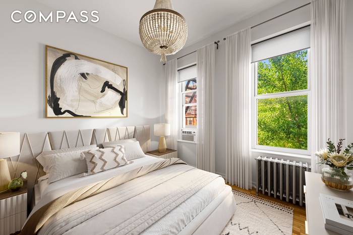 As you enter the apartment, you are greeted by an open, windowed kitchen area with two windows, a dishwasher, and ample cabinet space. The living area is cozy and accentuated by hardwood floors and high ceilings. The large front bedroom windows overlook the lush greenery of Perry Street, filling the space with natural light.