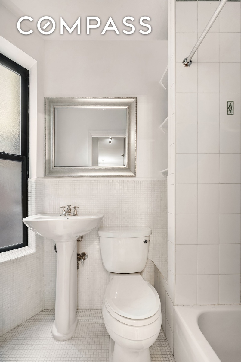The bathroom features classic white tiling, a window, and a shower-tub combination, creating a bright and clean space.