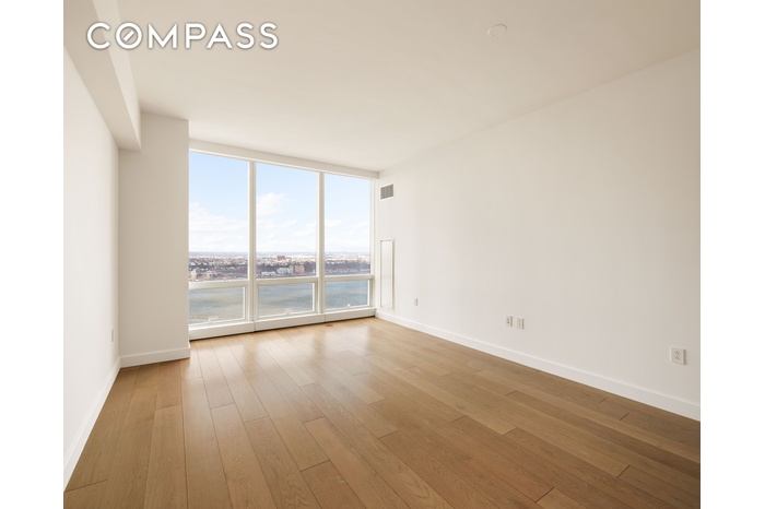 This elegant home features floor-to-ceiling windows, flooding the space with natural light while framing spectacular river and skyline views. The open-concept layout is designed for both comfort and style, featuring high ceilings, wide-plank oak flooring, and premium finishes throughout. The gourmet kitchen is outfitted with custom cabinetry, Miele appliances, and sleek marble countertops, creating the perfect space for cooking and entertaining. The spa-like bathroom offers a serene retreat, complete with a soaking tub, glass-enclosed shower, and bespoke vanity. A spacious walk-in closet and in-unit washer and dryer add to the home’s functionality and luxury.