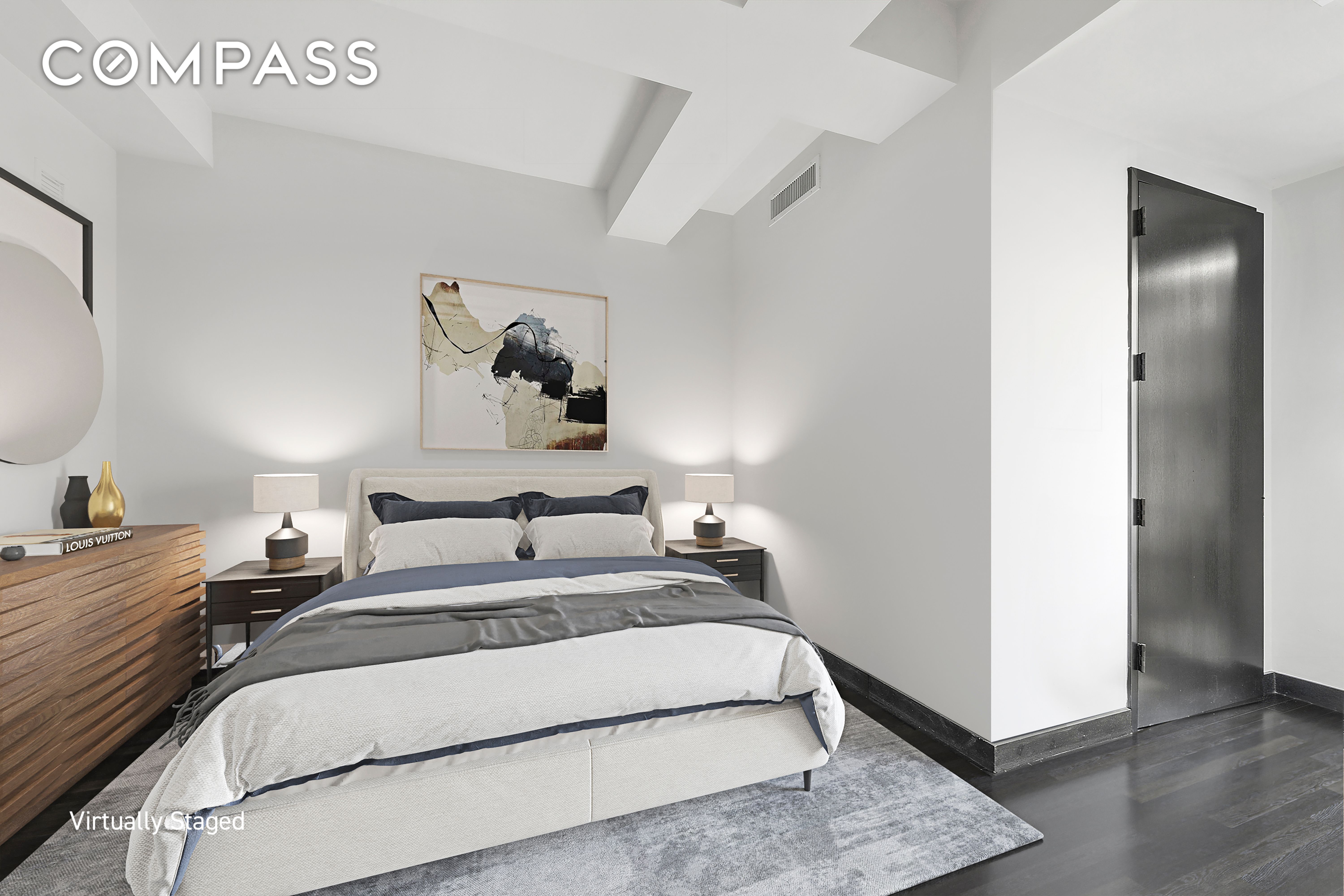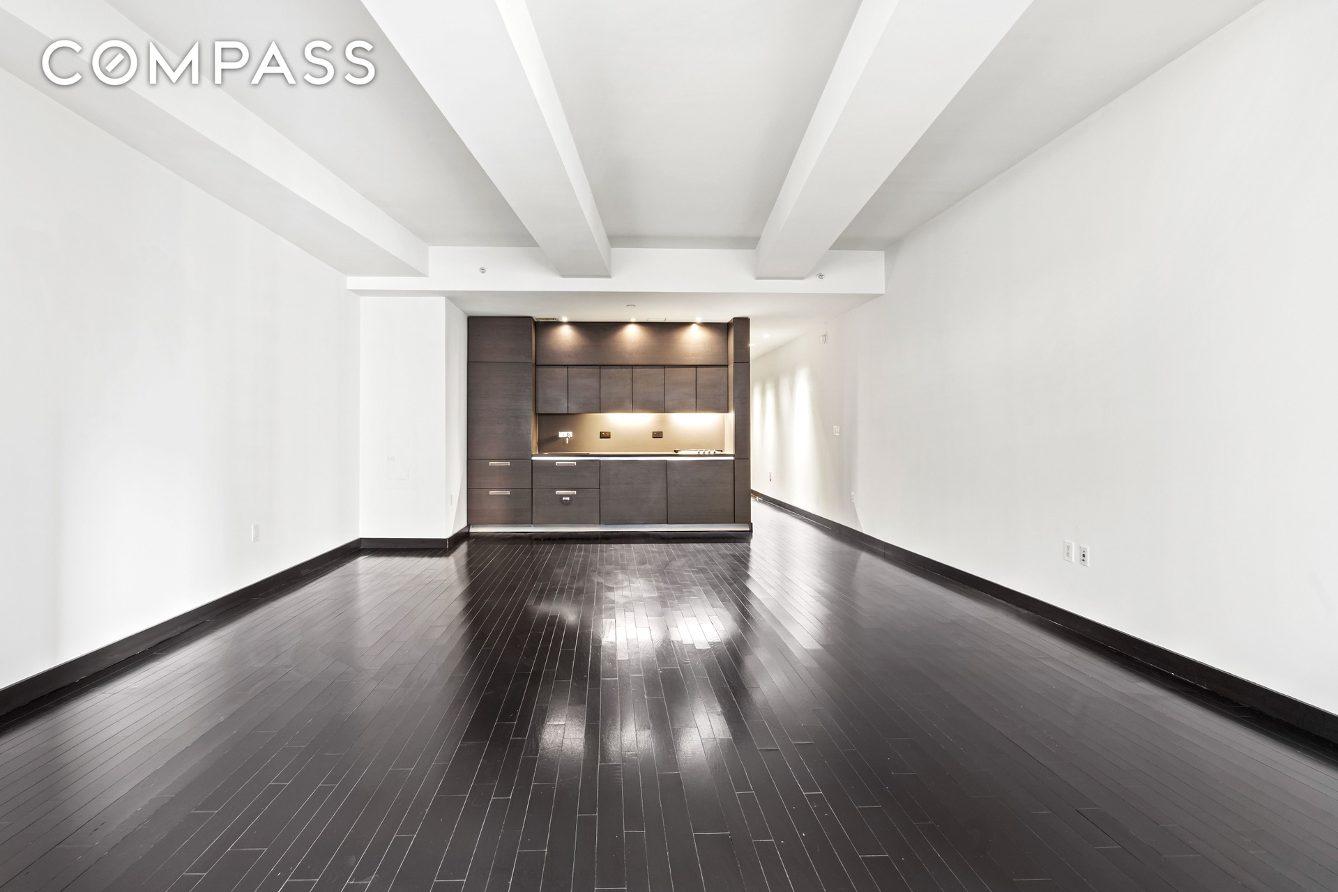 Welcome home to 20 Pine! Residence #1416 offers a stunning loft-style space within the luxurious Armani Casa Collection. This 14th-floor home is incredibly quiet, featuring a grand living area with 10' beamed ceilings. The open kitchen is equipped with Miele, Fisher & Paykel, Sub-Zero and LG appliances. Dark stained wood flooring runs throughout, and a generous flex space can comfortably accommodate a king-size bed.