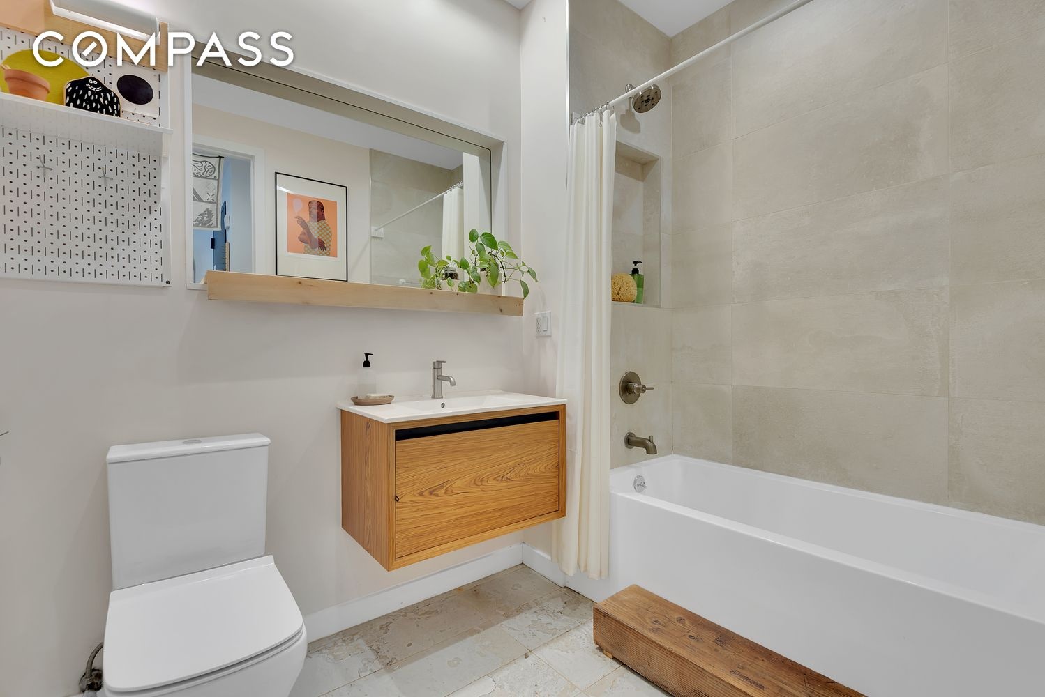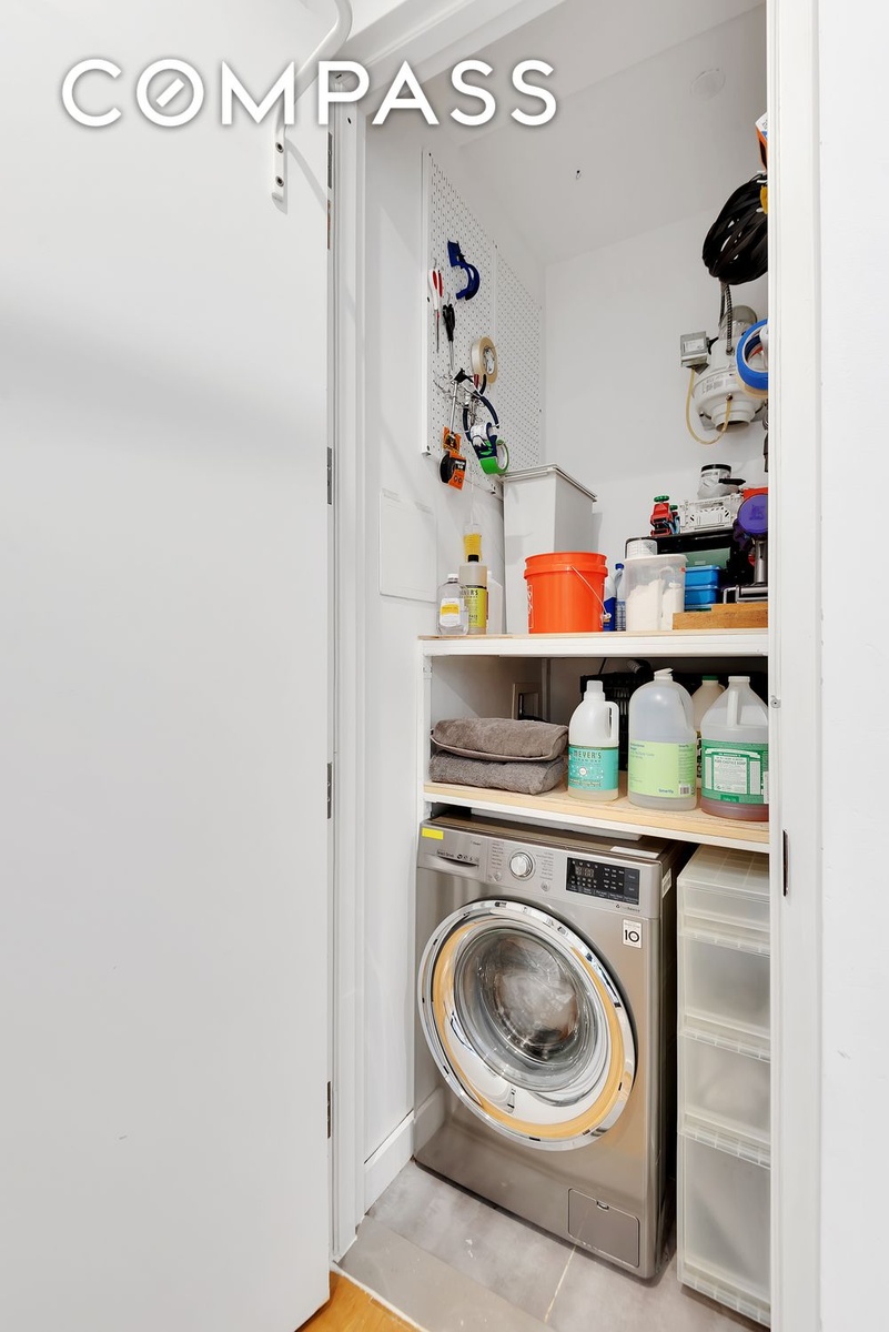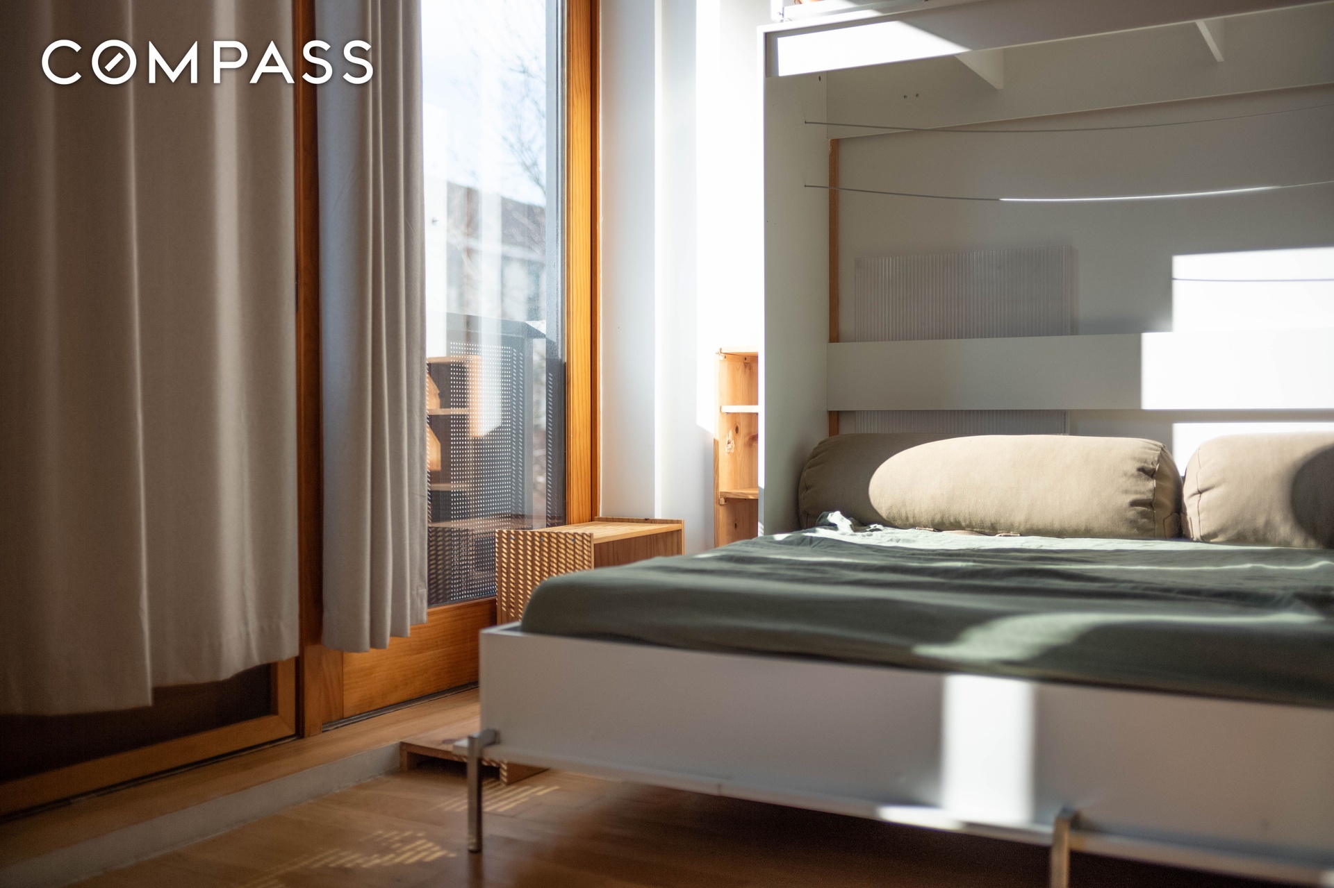 Inside, the layout provides distinct zones for dining, living, and resting. The kitchen is equipped with sleek Quartz countertops, custom German cabinetry, and premium appliances like a Fisher & Paykel refrigerator and Bosch dishwasher and range. The entry foyer leads to both a walk-in closet and a utility closet housing a 2-in-1 washer and dryer. Central heating and air conditioning enhance comfort, while a private storage room is located in the building’s basement.