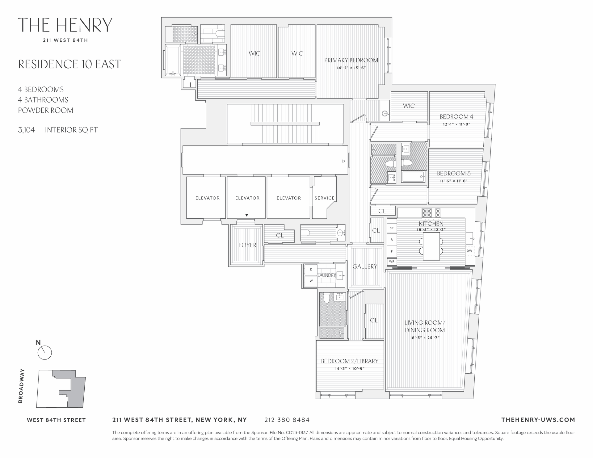 CLOSINGS BEGIN THIS FALL. Residence 10E at The Henry is a graciously proportioned 4-bedroom apartment with wonderful Park and open city views east and south from every room. Direct elevator access into a private foyer opens to a square gallery and a corner loft-like living room with breathtaking views of Central Park and the southern skyline. A large eat-in kitchen, with a picture window facing east to the Park, has pocket doors, allowing it to be an open kitchen or closed for more formal moments. All four bedrooms have ensuite baths and generous closet space. One secondary bedroom could easily be a library, and another could be incorporated to create a primary suite. The primary bedroom is ideally located for privacy and has a stunning five fixture bath and two very large walk-in closets. 10E has a full-sized laundry room with a sink, a second apartment entrance and a lovely powder room.