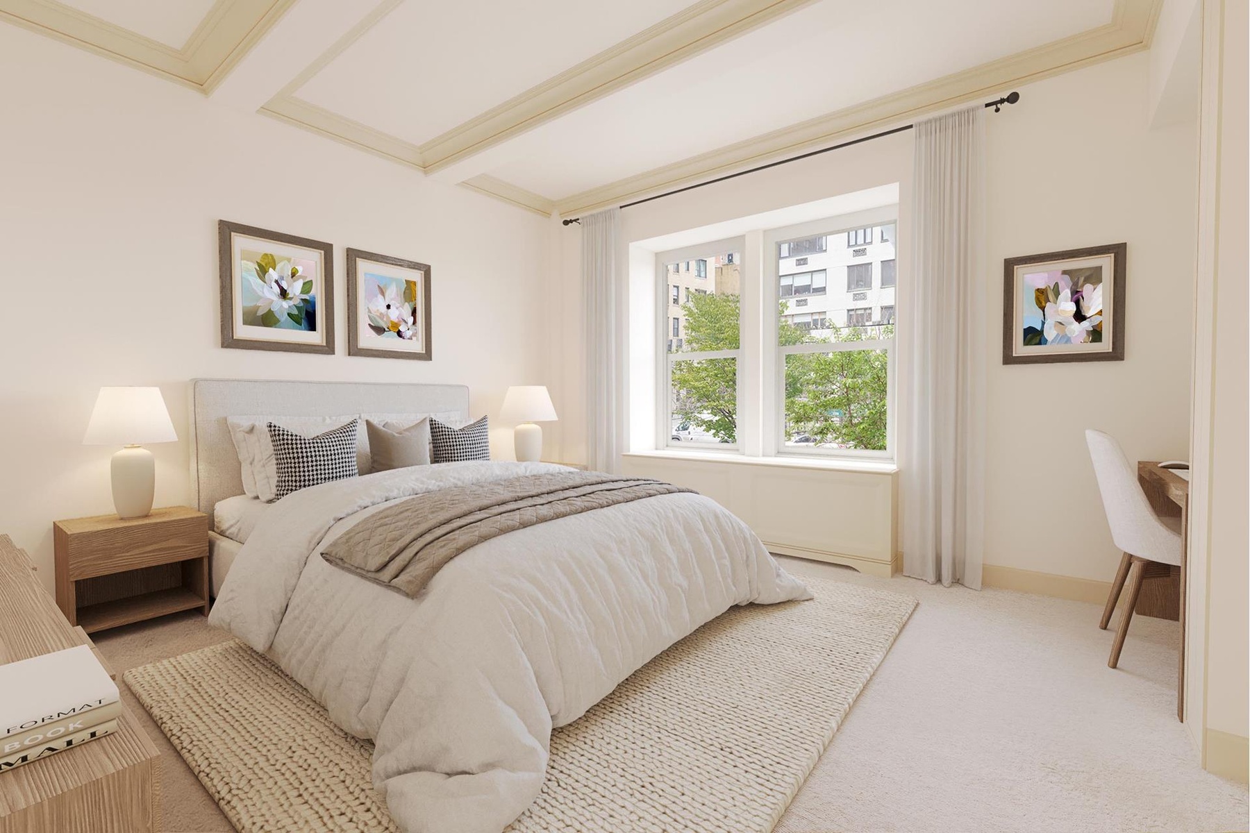 The primary bedroom boasts oversized windows, built-in closets and desk, an en-suite bath with double vanity, and a steam shower. The secondary bedroom features a full wall of closets and a windowed en-suite bath with custom vanity, and a deep soaking tub. The primary and secondary bedrooms are currently connected, with the secondary bedroom configured as a dressing room.