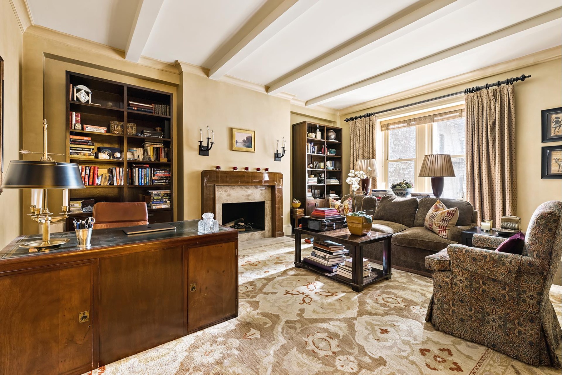 The foyer opens up to a spacious west-facing living and dining room complete with a wood burning fireplace and overlooks Park Avenue. The home features beautiful custom moldings and trim, original hardwood floors with ribbon detail, and 9.5" ceilings.