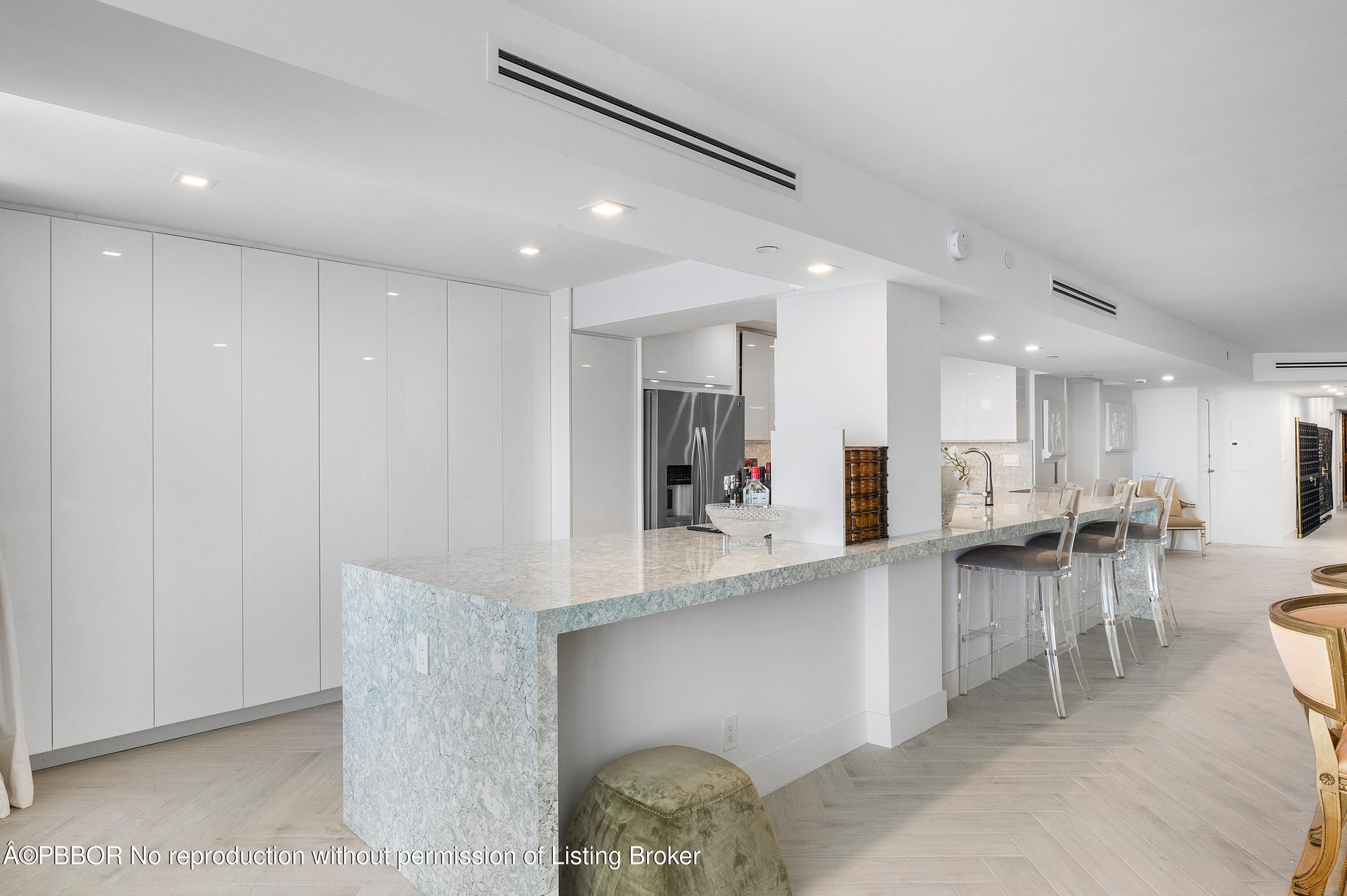 Enter into coastal modern luxury with this fully renovated 2,400sqft, 2-bedroom, 2.5-bathroom oceanfront residence at the exclusive 3600 S Ocean. Accessible via a private elevator entrance, this elegantly designed condo boasts breathtaking direct ocean views to the east and serene sunset vistas to the west from its ultra-large private balconies. The open-concept kitchen w/ ultra-long island and great room are an entertainer's dream, featuring detailed quartz countertops, high-end appliances, a wet bar, and a wine fridge. The residence showcases chevron wood tile flooring throughout, impact glass windows, fitted walk-in closets, and spa-inspired bathrooms. Additional conveniences include an in-unit washer/dryer and two covered parking spaces. Enjoy resort-style living with an oceanfront... pool, fitness center, and private beach access in this boutique building. Located moments from Eau Palm Beach, the Four Seasons, premier shopping, and dining, with easy access to PBI Airport and Downtown West Palm Beach. Luxury coastal living at its finest.