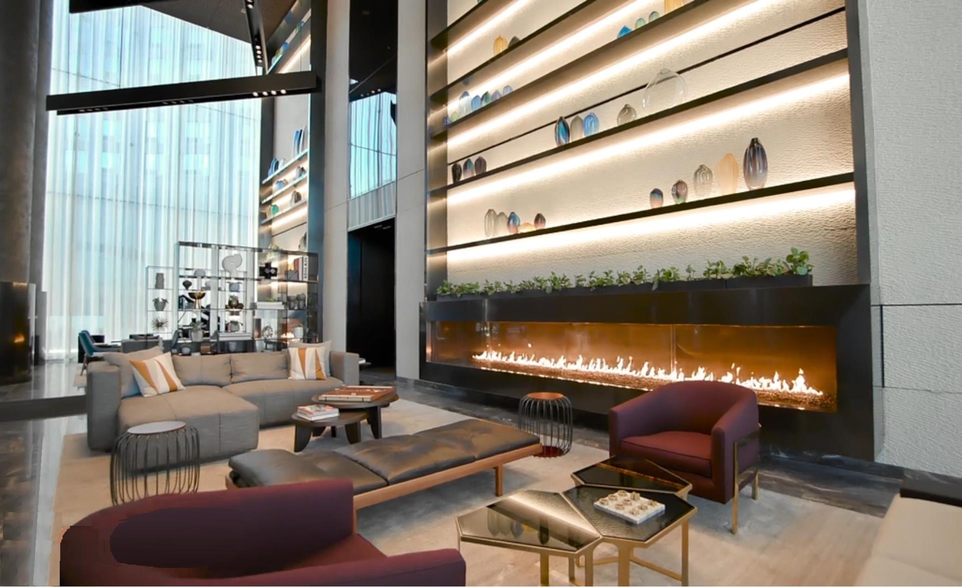 -Grand double-height lobby with two seating areas and fire places